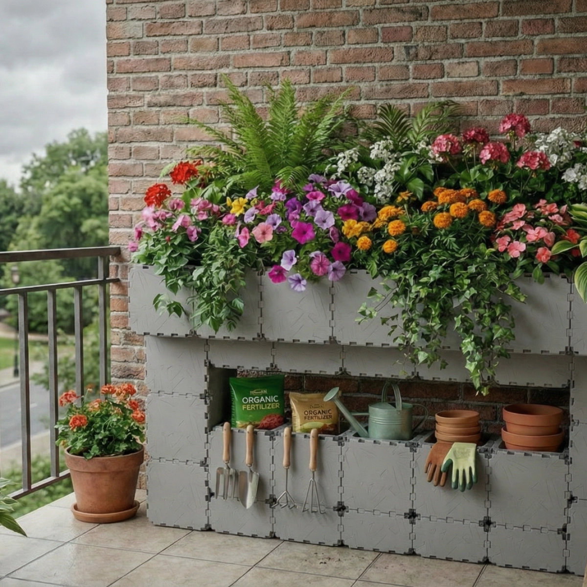 Kompaktowa modułowa donica zaprojektowana z myślą o balkonach i małych przestrzeniach zewnętrznych, łącząca obszary sadzenia ze zintegrowanymi schowkami na narzędzia. Liniowa forma idealnie pasuje do balustrad lub ścian, utrzymując zioła, zielenie i małe rośliny uporządkowane i łatwo dostępne. Nadaje się do tworzenia funkcjonalnych i uporządkowanych ogrodów na balkonach lub loggiach.