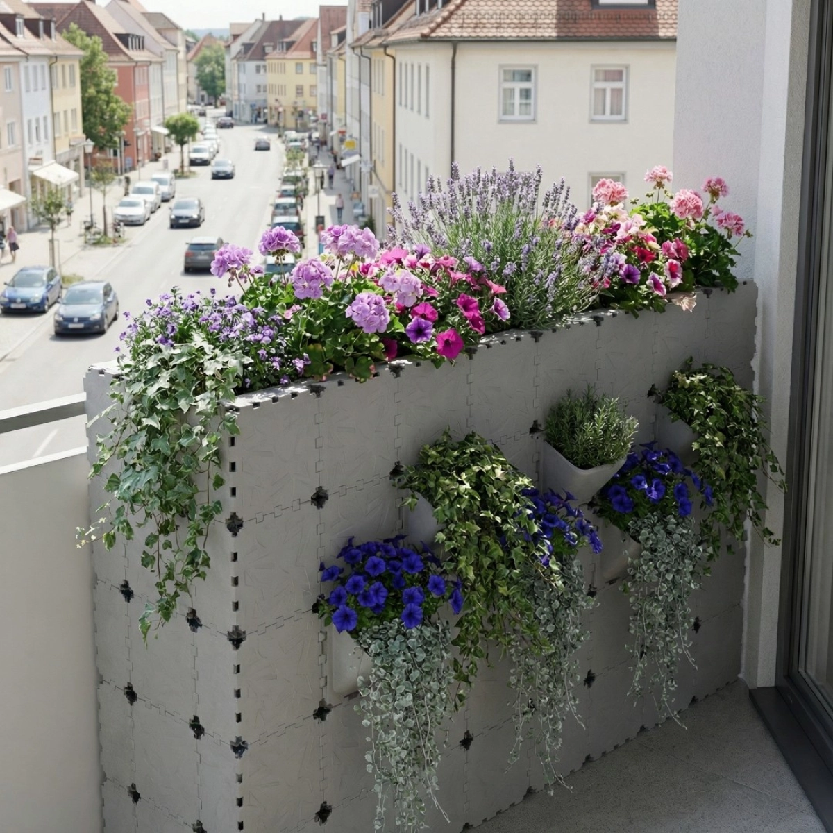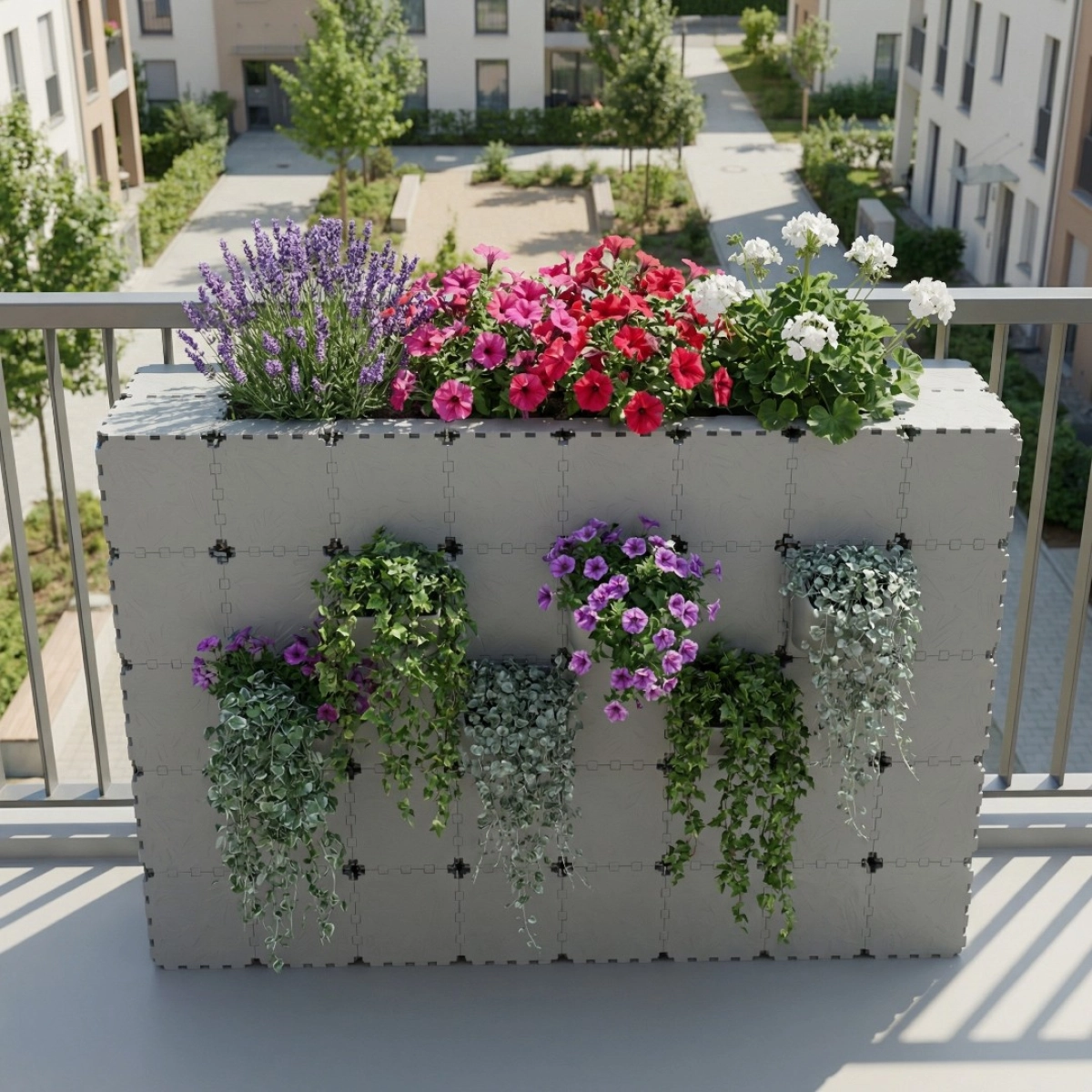 Modułowa donica zaprojektowana z myślą o stworzeniu pełnego ogrodu na balkonie. Dekoracyjne panele Flora dodają głębi i tekstury, podczas gdy konstrukcja wspiera kwiaty, zioła i małe rośliny. Idealna na balkony, loggie i małe tarasy, odpowiednia zarówno do użytku wewnątrz, jak i na zewnątrz.
