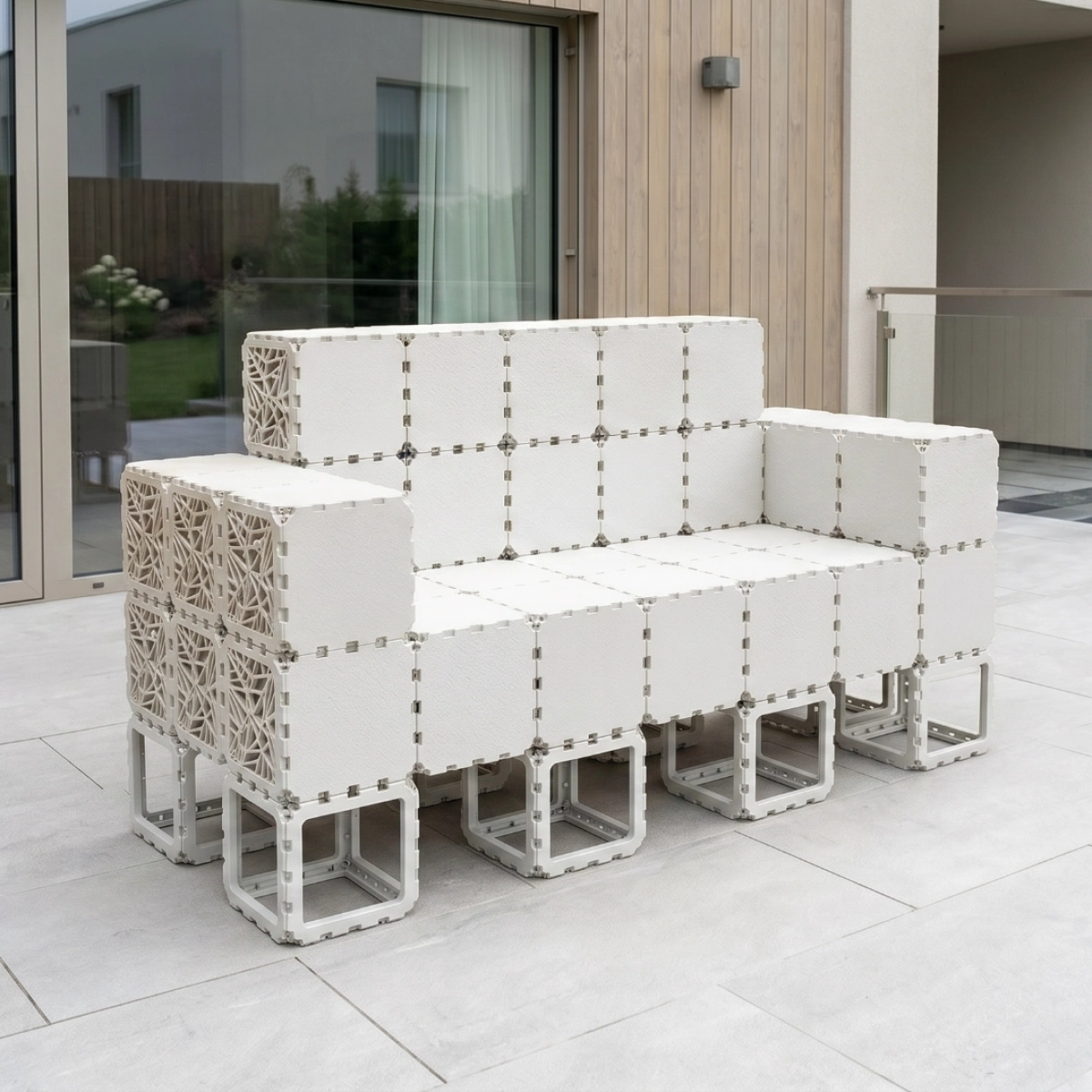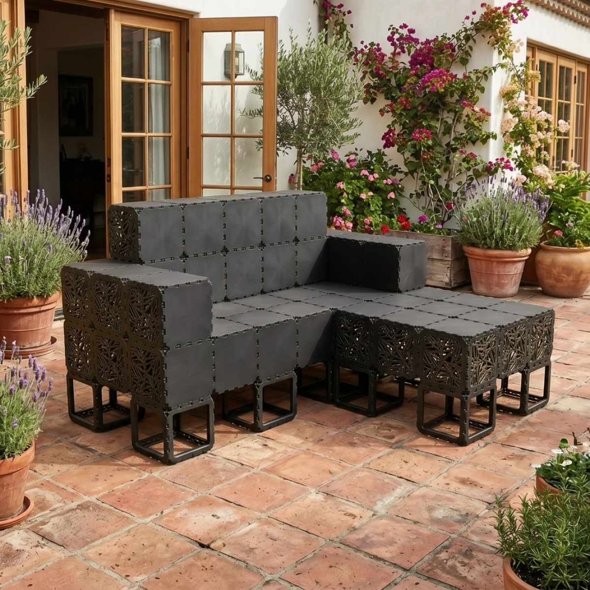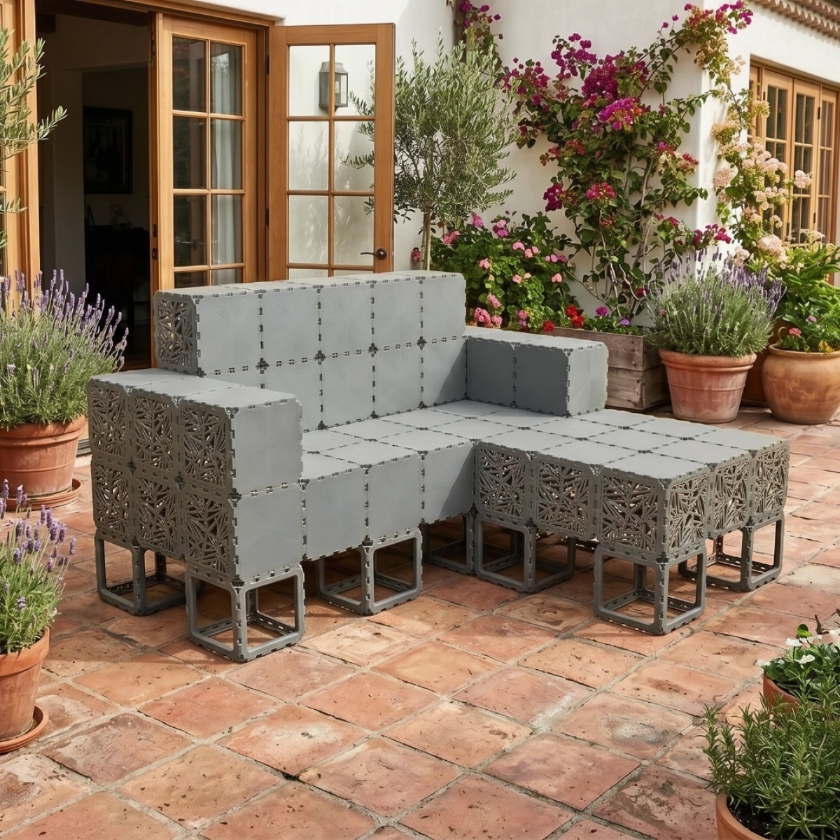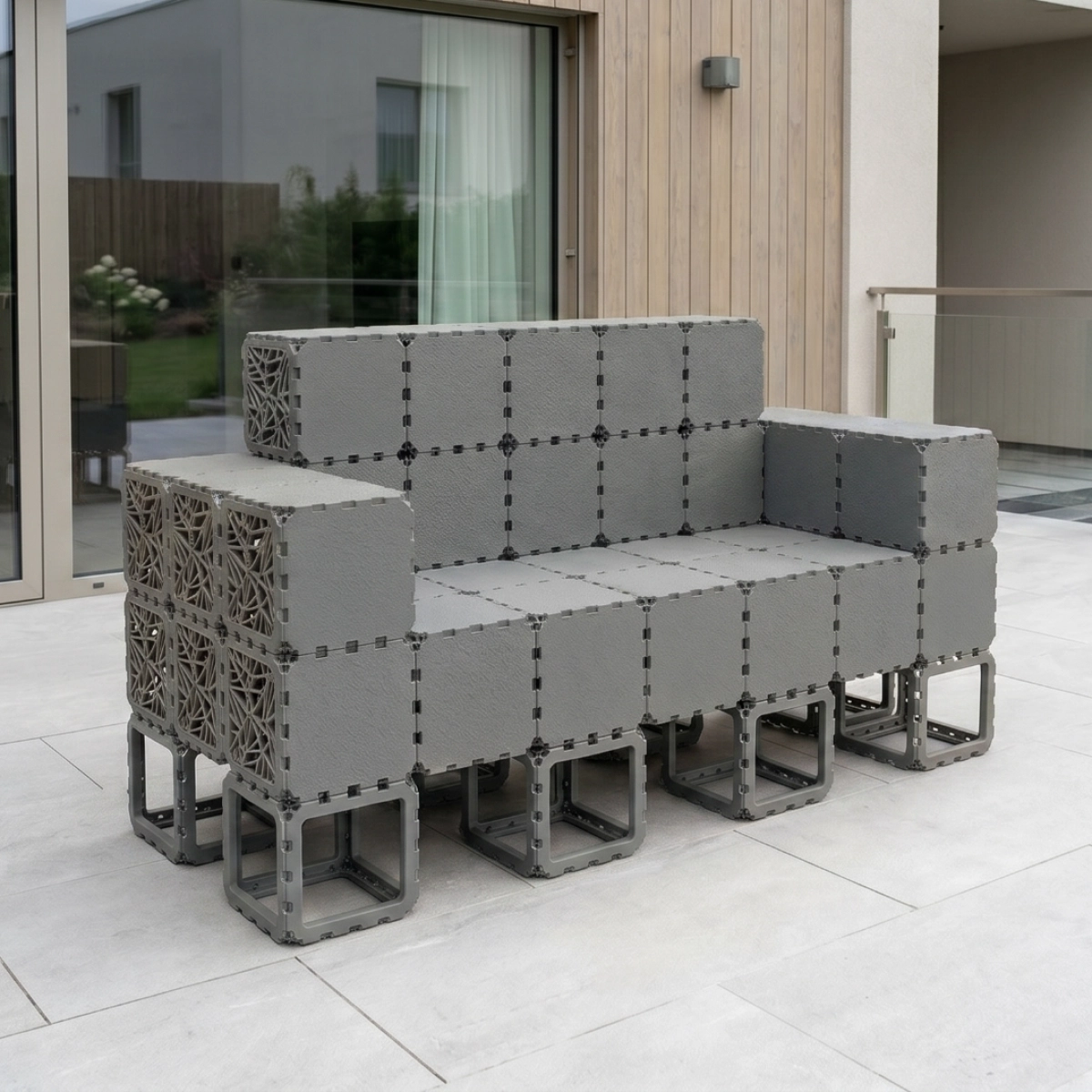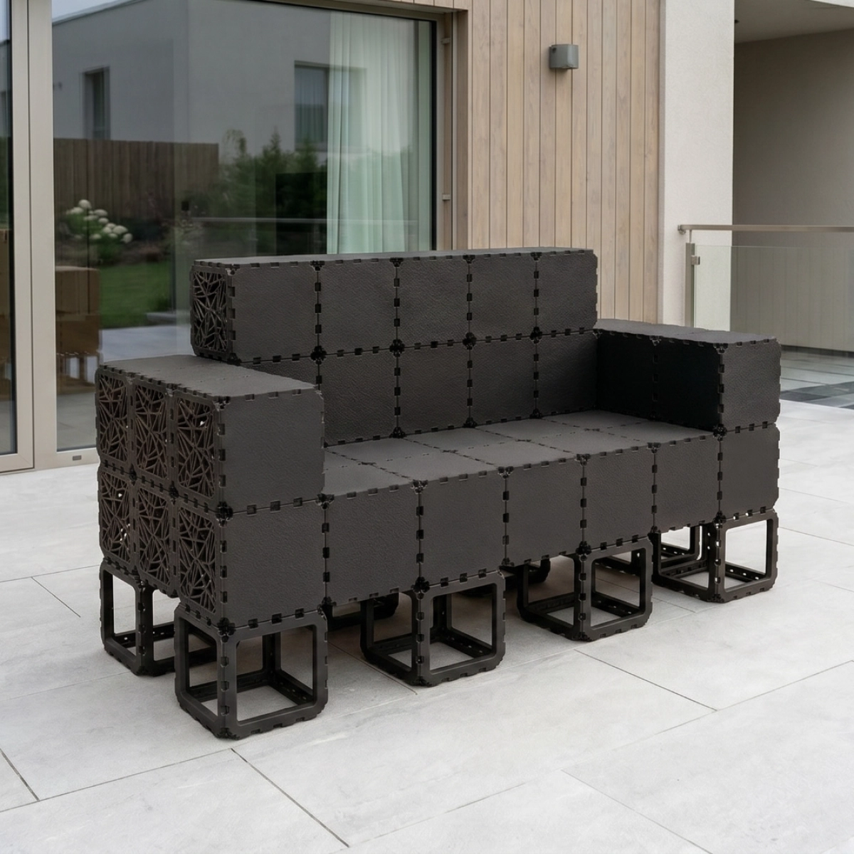A modular outdoor sofa system built from Cubik elements, designed for flexible configurations and modern spaces.