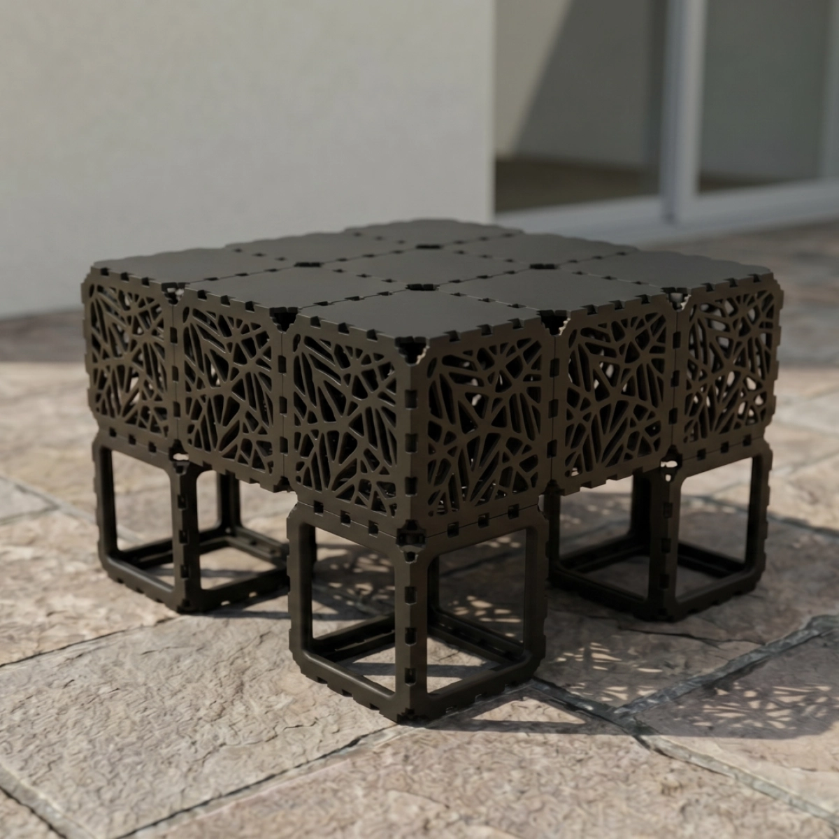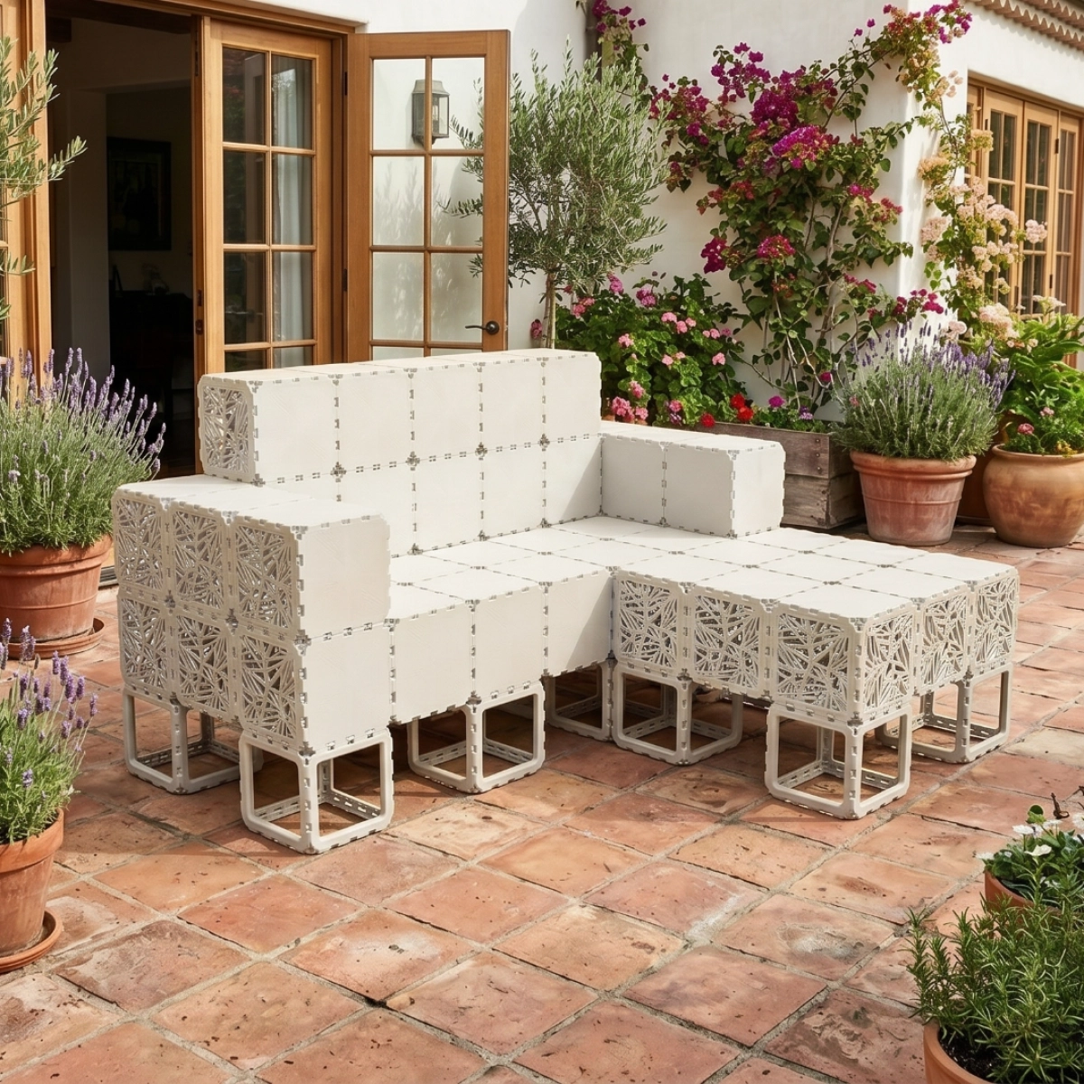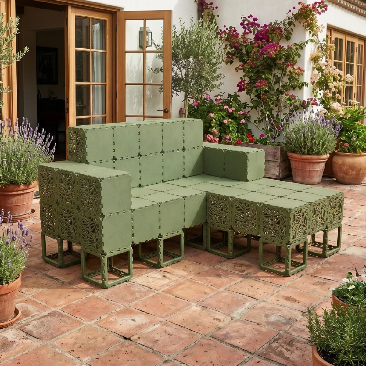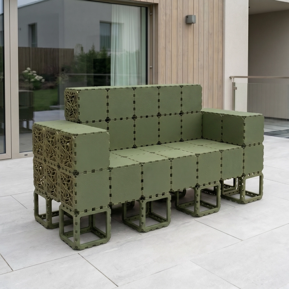 A modular outdoor sofa system built from Cubik elements, designed for flexible configurations and modern spaces.