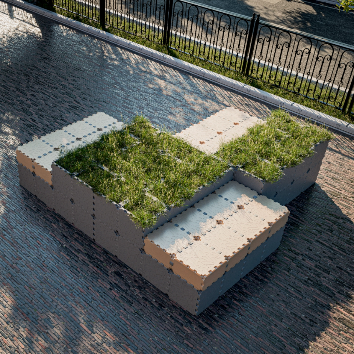Niski, blokowy zestaw wypoczynkowy połączony z sekcjami donic wypełnionymi zielenią. Zaprojektowany dla 4-6 osób, łączy funkcjonalne siedzisko z naturalnymi elementami. Nadaje się do publicznych placów, dziedzińców lub prywatnych ogrodów. Modułowy system umożliwia łatwą zmianę rozmiaru lub rekonfigurację za pomocą dodatkowych bloków.