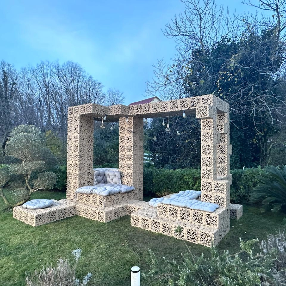 Otwarta konstrukcja wypoczynkowa zbudowana z kubików Bion. Łączy w sobie miejsce do siedzenia i formę architektoniczną, tworząc zacienioną przestrzeń zewnętrzną do relaksu lub spotkań. Nadaje się do prywatnych ogrodów, patio lub parków publicznych. Modułowa konstrukcja umożliwia łatwą zmianę rozmiaru, rekonfigurację lub integrację oświetlenia i zieleni.