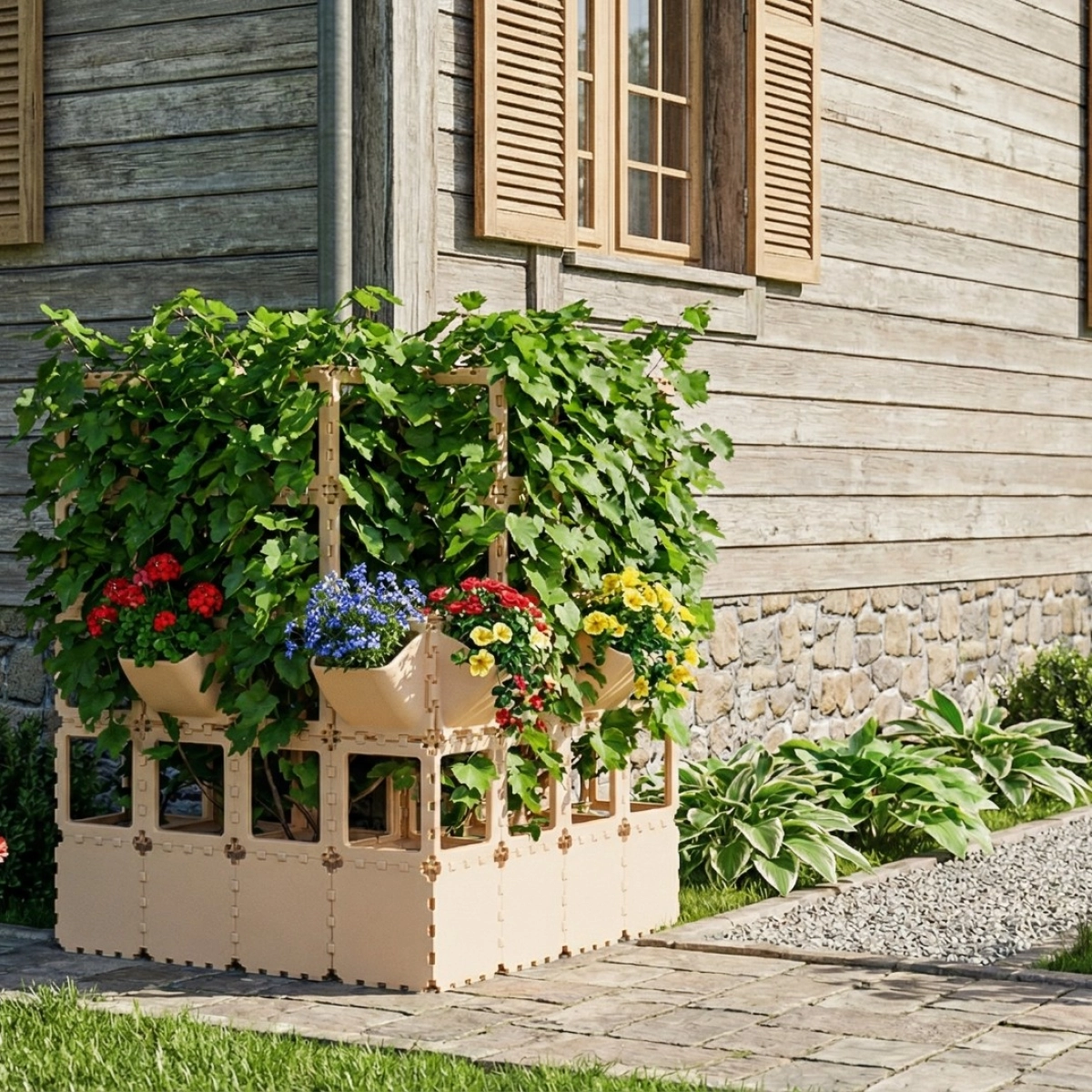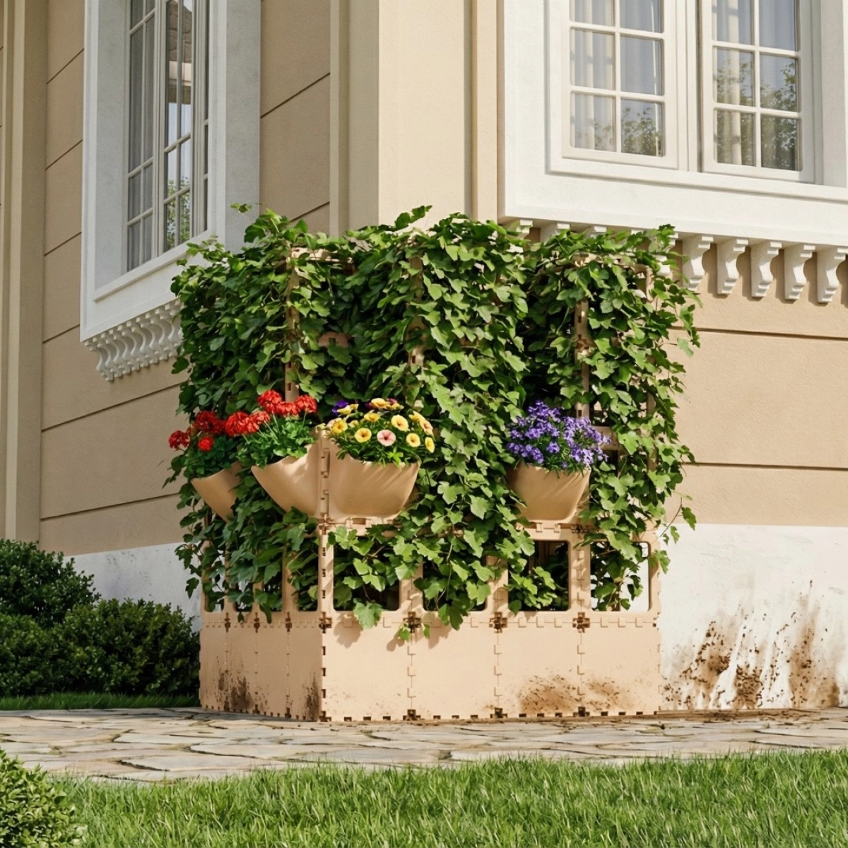 Modułowa konstrukcja umożliwia elastyczną konfigurację - od pustej struktury architektonicznej do w pełni obsadzonego pionowego ogrodu. Nadaje się do całorocznego użytku na zewnątrz, uzupełnia nowoczesną architekturę mieszkaniową i naturalnie wtapia się w zagospodarowane podwórka.