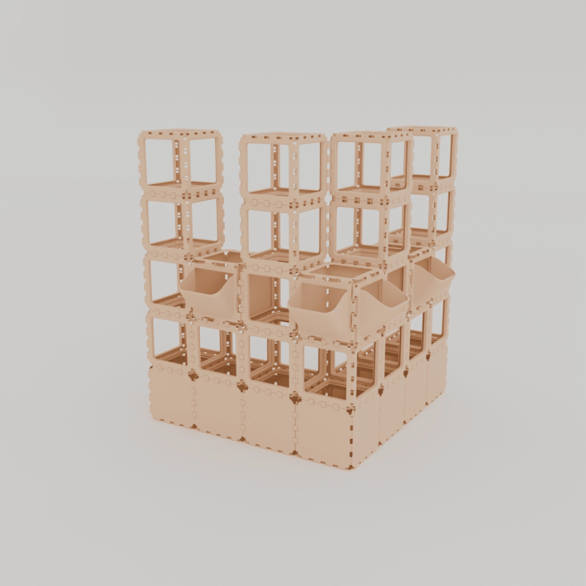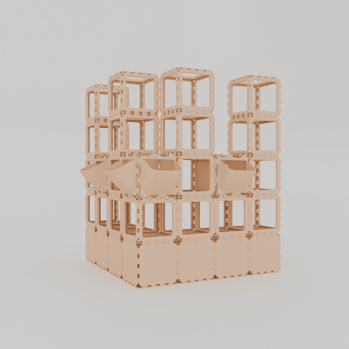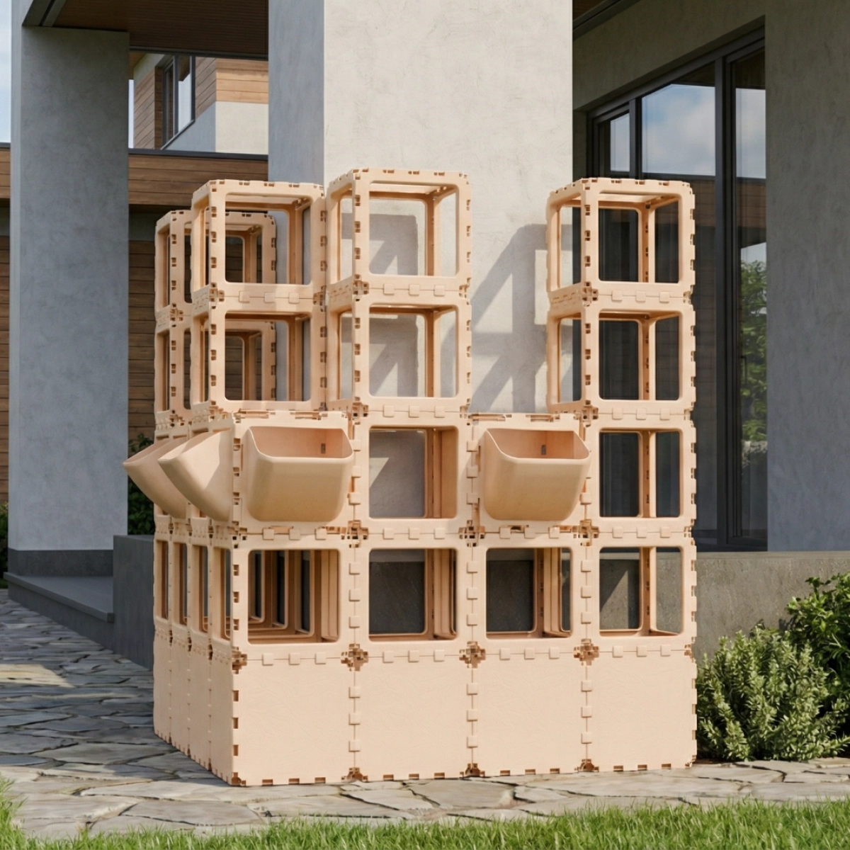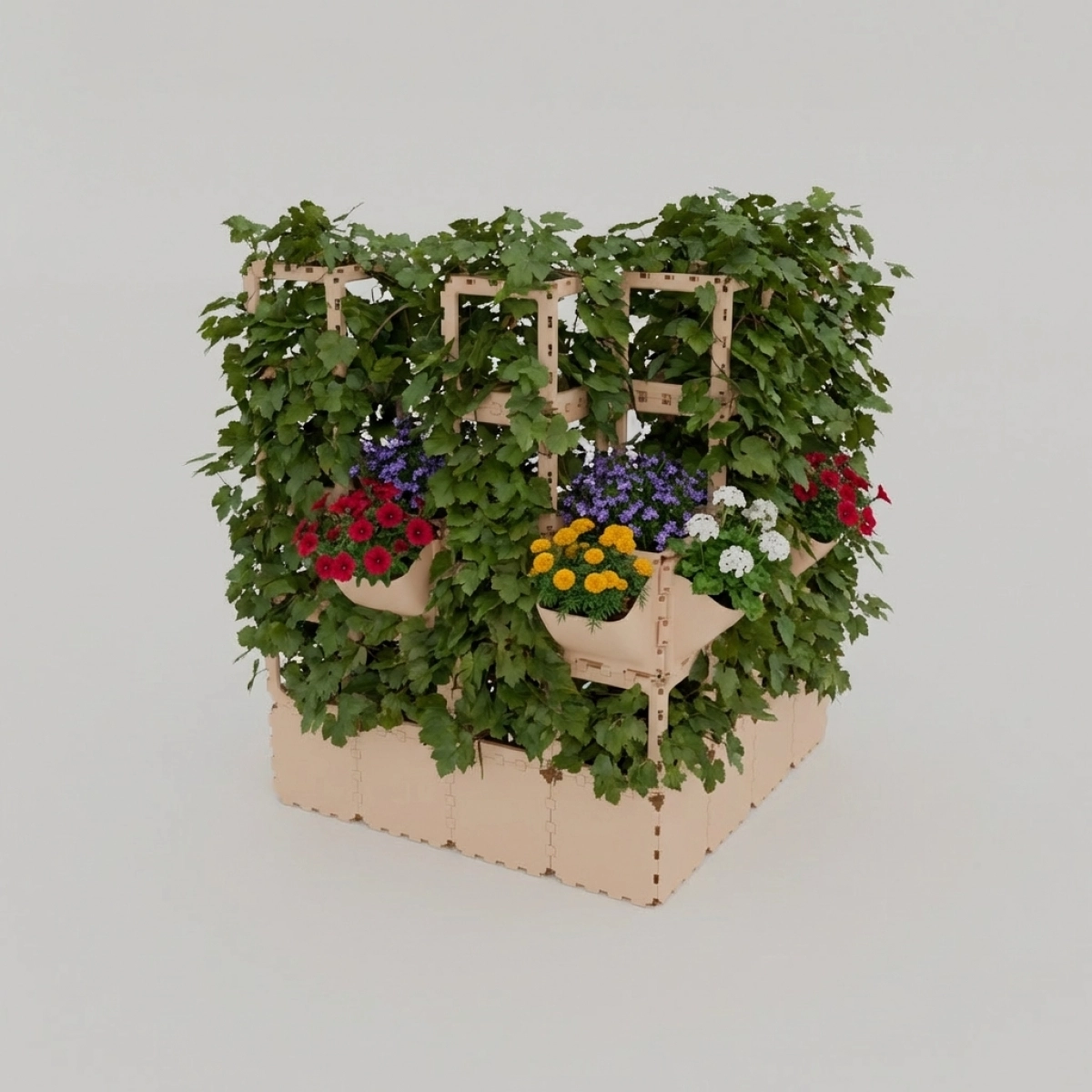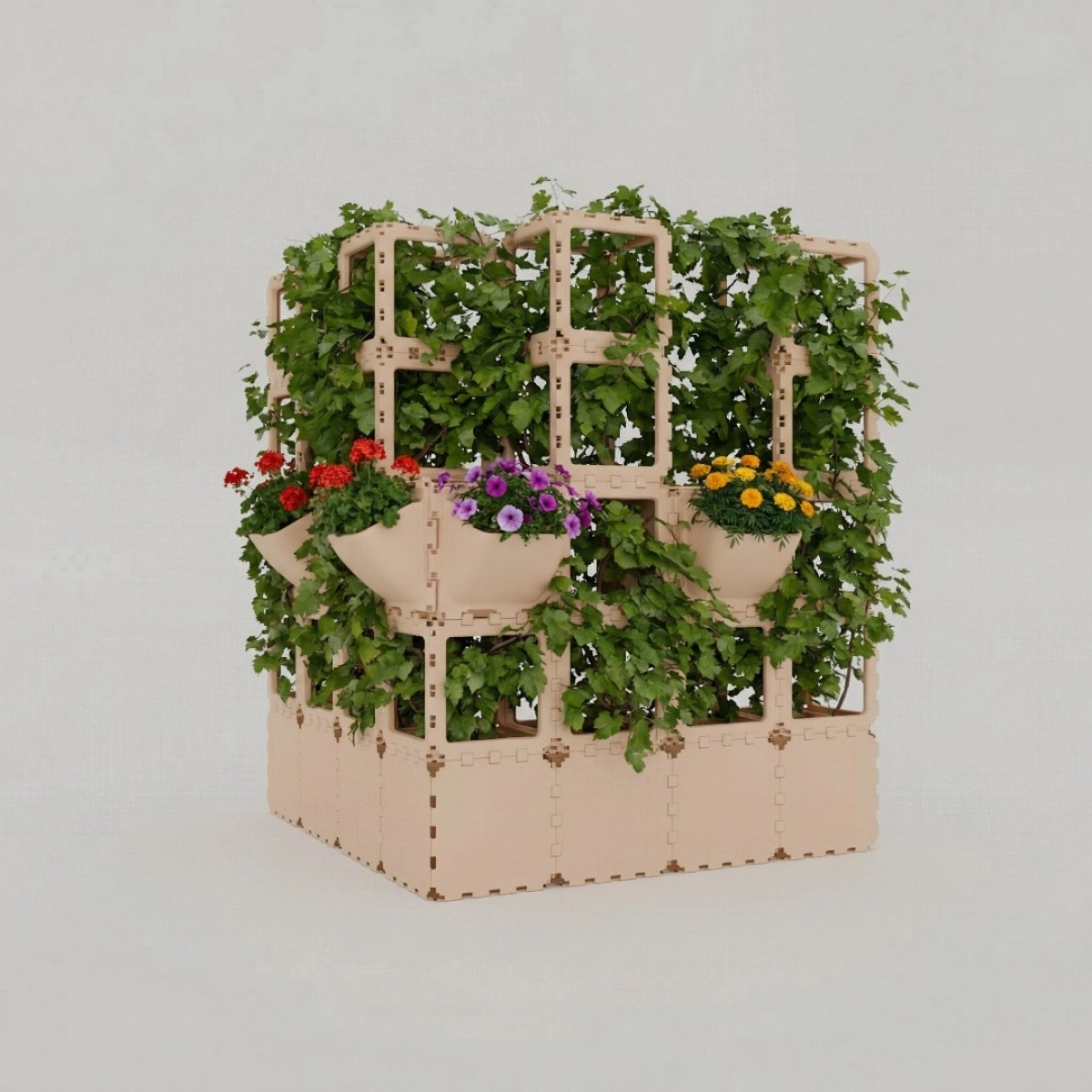 Konstrukcja zbudowana jest z geometrycznych modułów, które można układać jeden na drugim, tworząc stabilną pionową ramę, pozwalającą roślinom rosnąć w górę, przy jednoczesnym zachowaniu niewielkich rozmiarów. Zintegrowane elementy do sadzenia wspierają rośliny pnące, zieleń dekoracyjną i małe krzewy, przekształcając system w żywą, zieloną objętość.