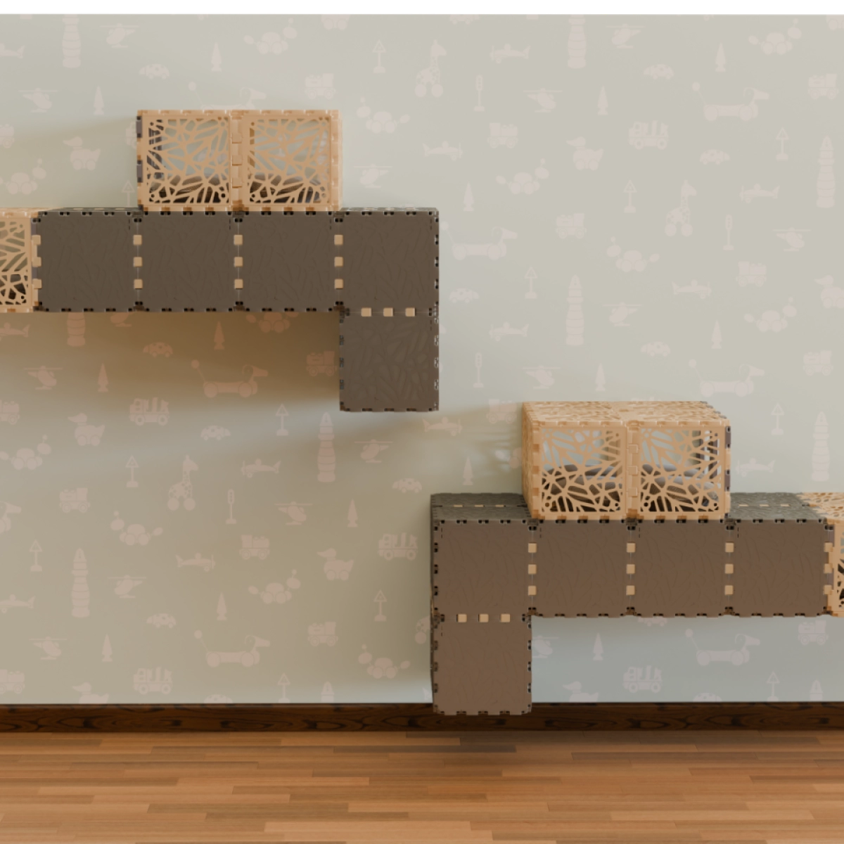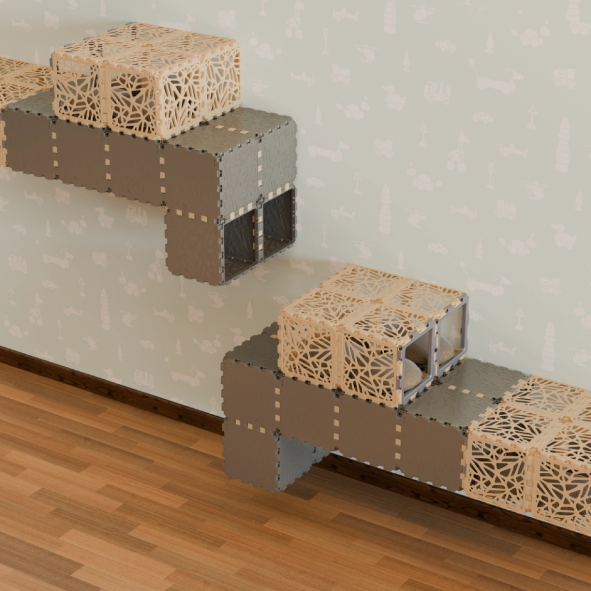 Modułowy, montowany na ścianie domek dla kota zbudowany z kostek Cubik, tworzący podwyższone tunele, półki i przytulne miejsca do odpoczynku. Konstrukcja pozwala zachować wolną podłogę, jednocześnie zmieniając ścianę w zabawny pionowy krajobraz dla zwierząt. Czas montażu - około 1-2 godzin.
