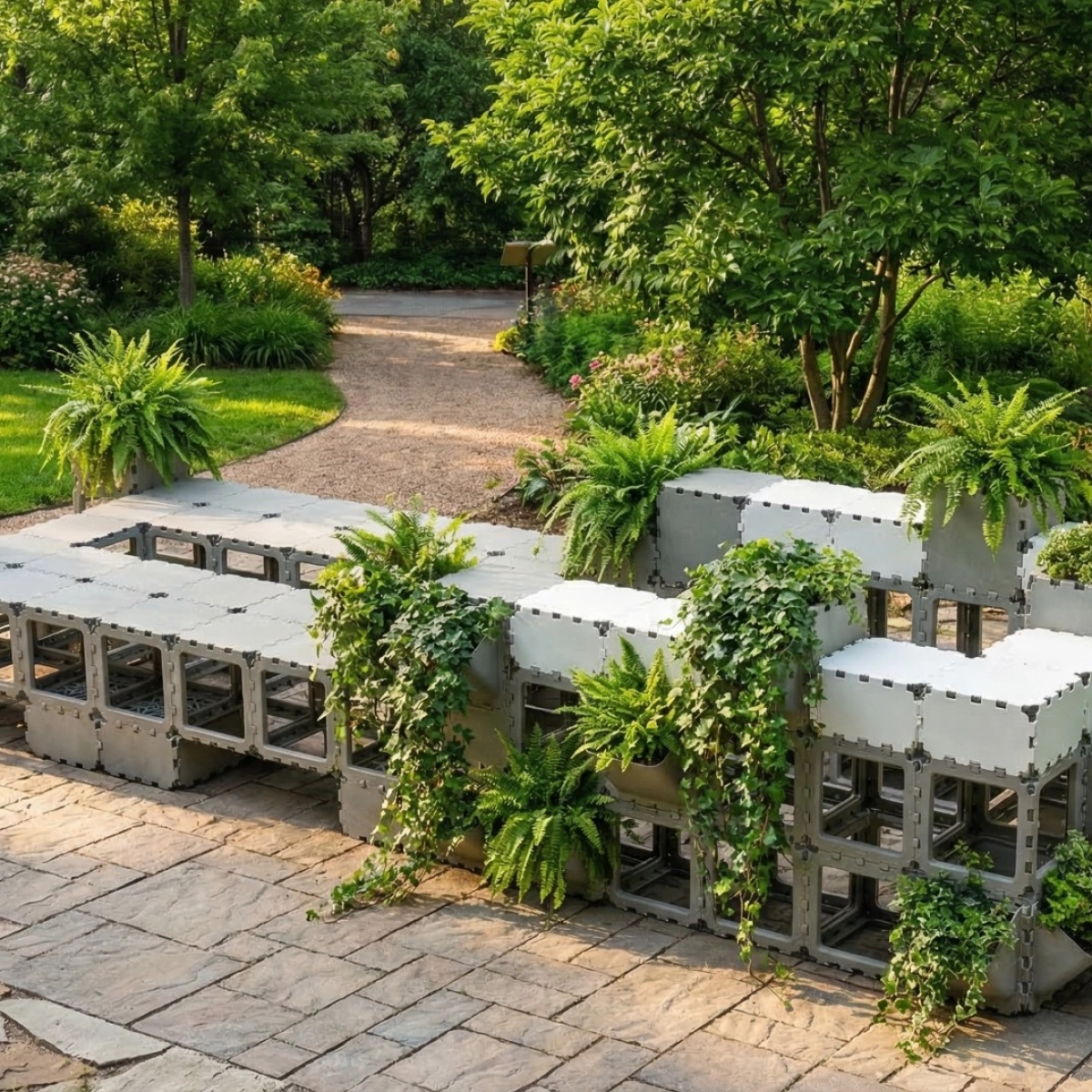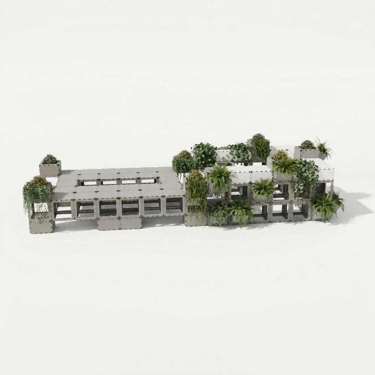 A modular seating area with integrated planters designed for public spaces, terraces, and lounge zones. This configuration combines seating, greenery, and clean architectural lines in one functional composition, creating a durable and visually striking solution that can be easily assembled, adapted, and reconfigured for different layouts. The tone and positioning here follow your Public Spaces catalog language around modularity, durability, aesthetics, and lounge/reception-style use cases.