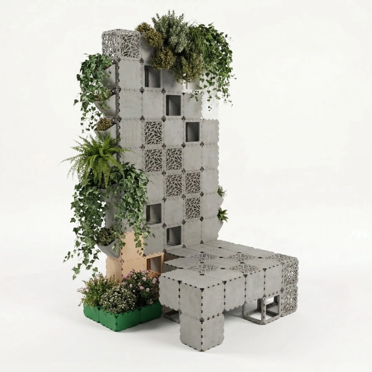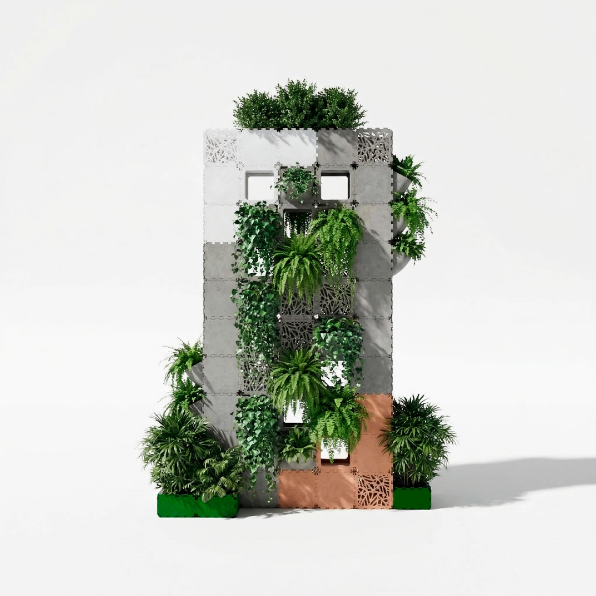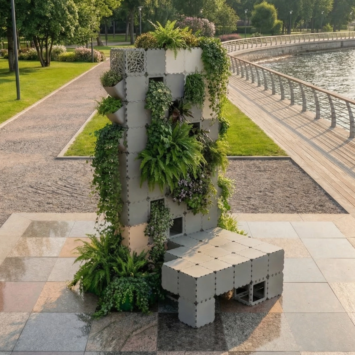 A modular vertical garden designed for urban environments, combining greenery with a compact architectural structure. The system integrates planting modules directly into the facade, allowing dense vertical landscaping in limited spaces. Suitable for courtyards, embankments, parks, and residential developments, it functions both as a visual landmark and as a natural zoning element. Easily scalable and adaptable to different heights and configurations.