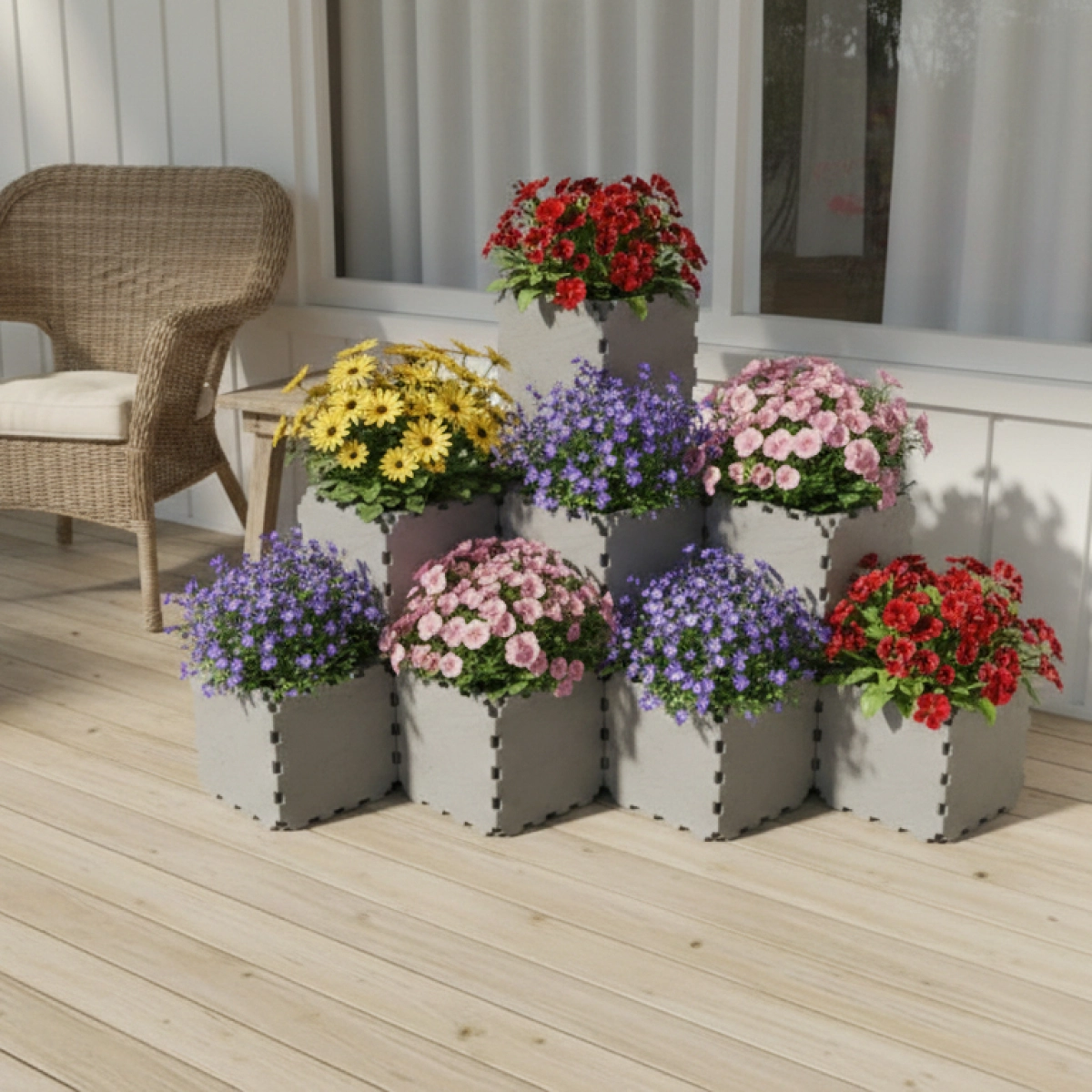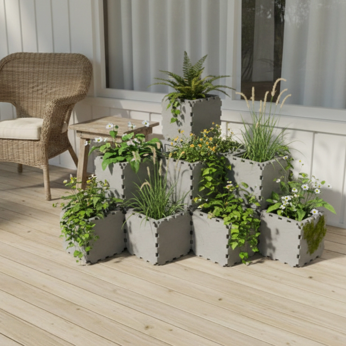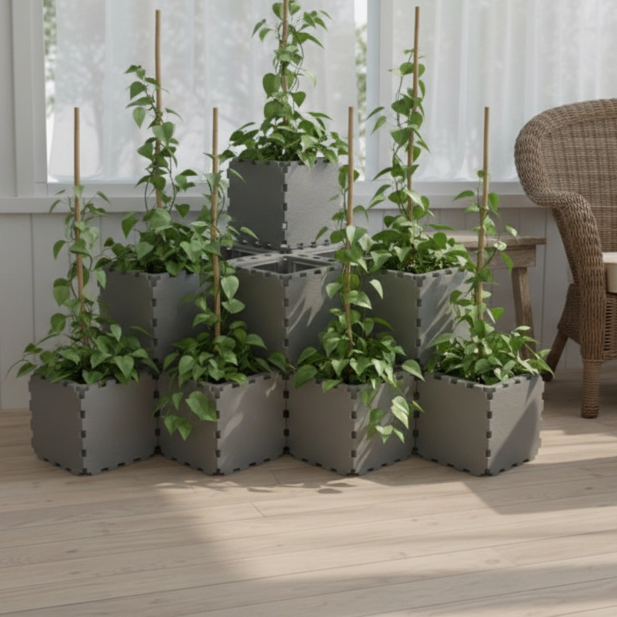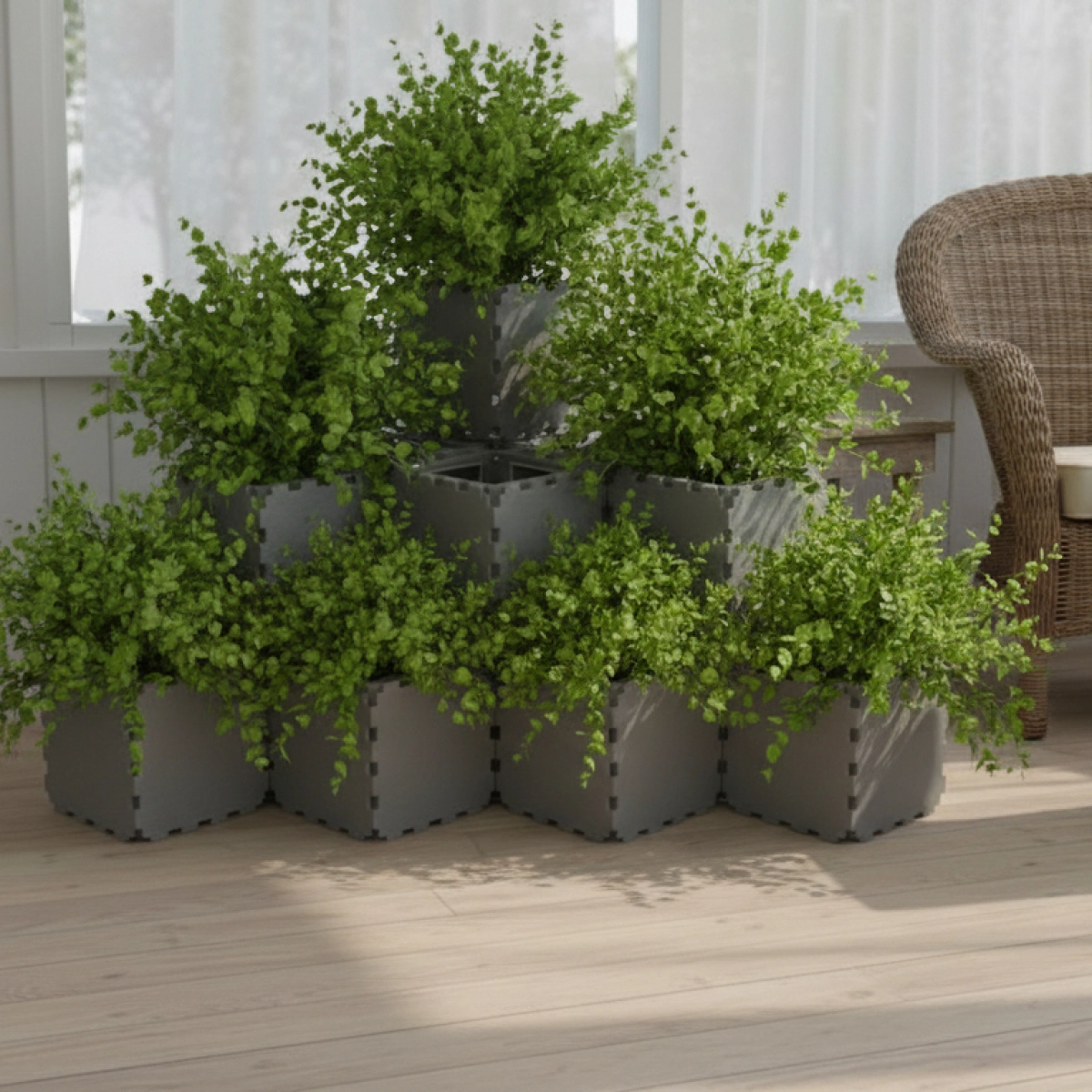 Nowoczesna narożna modułowa donica zaprojektowana do tworzenia pięknych stopniowanych roślin w każdym wnętrzu lub na balkonie. Zbudowana z kostek Cubik.one, struktura ta pozwala na uprawę wielu roślin w jednym pionowym układzie, jednocześnie oszczędzając miejsce na podłodze.