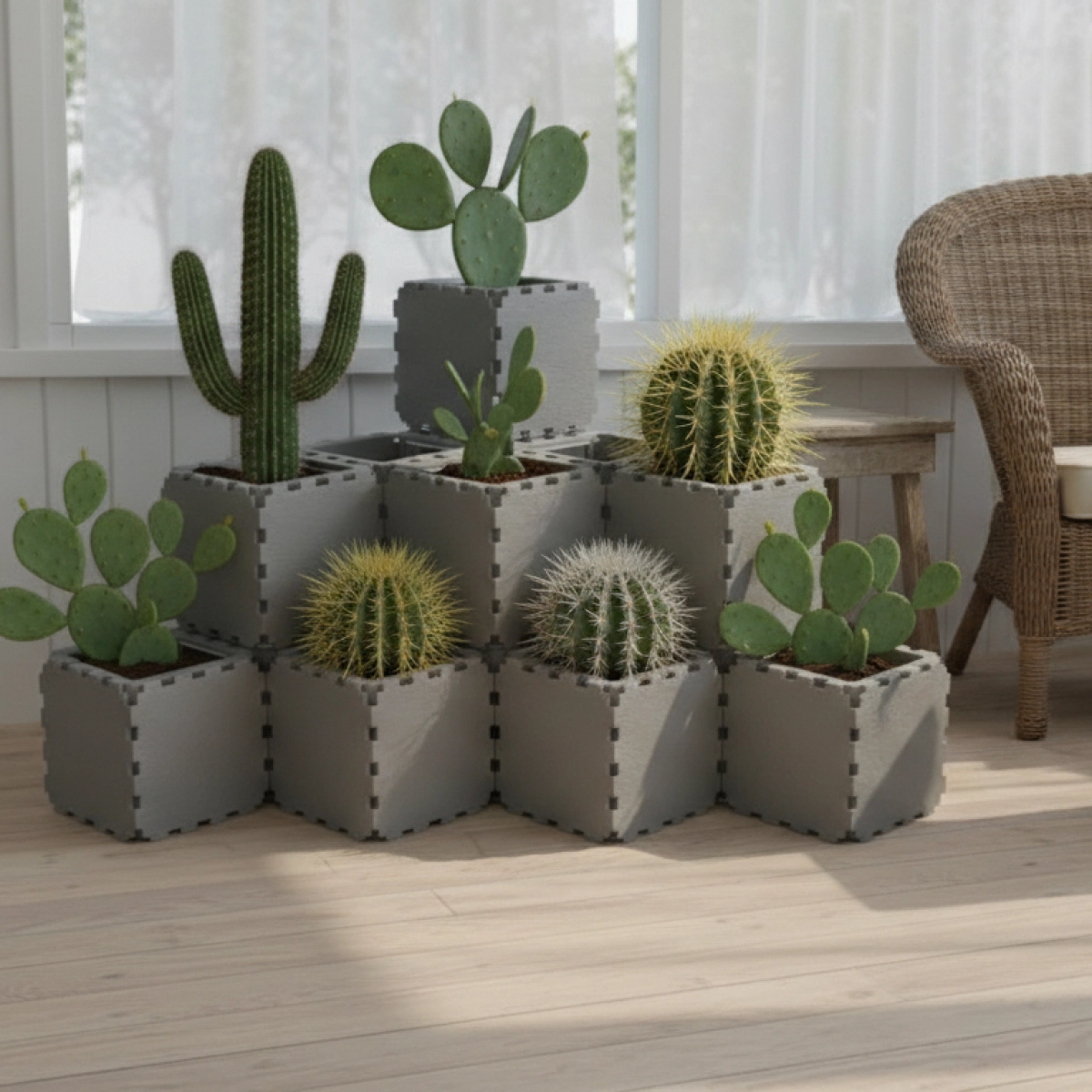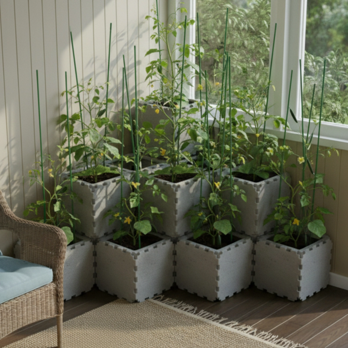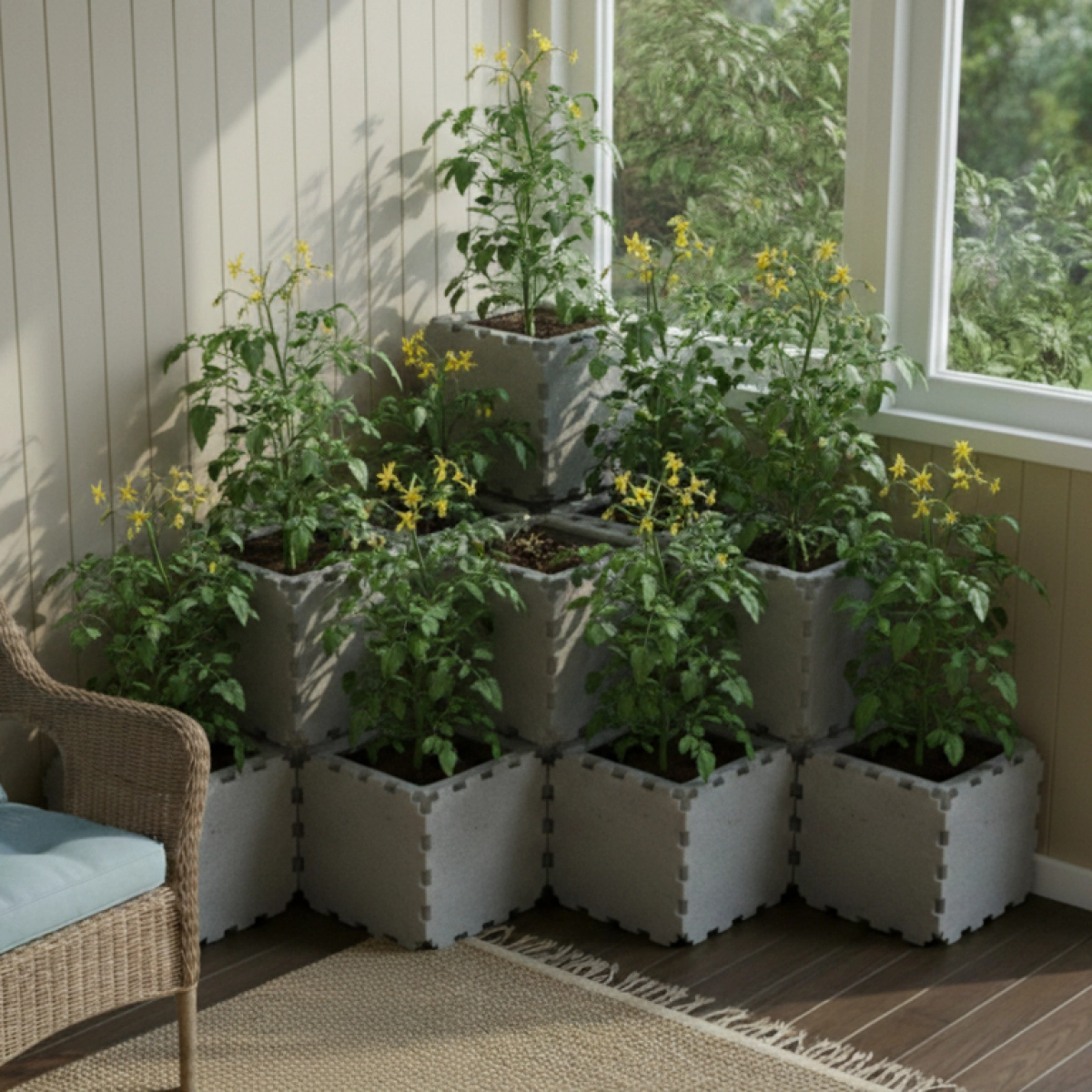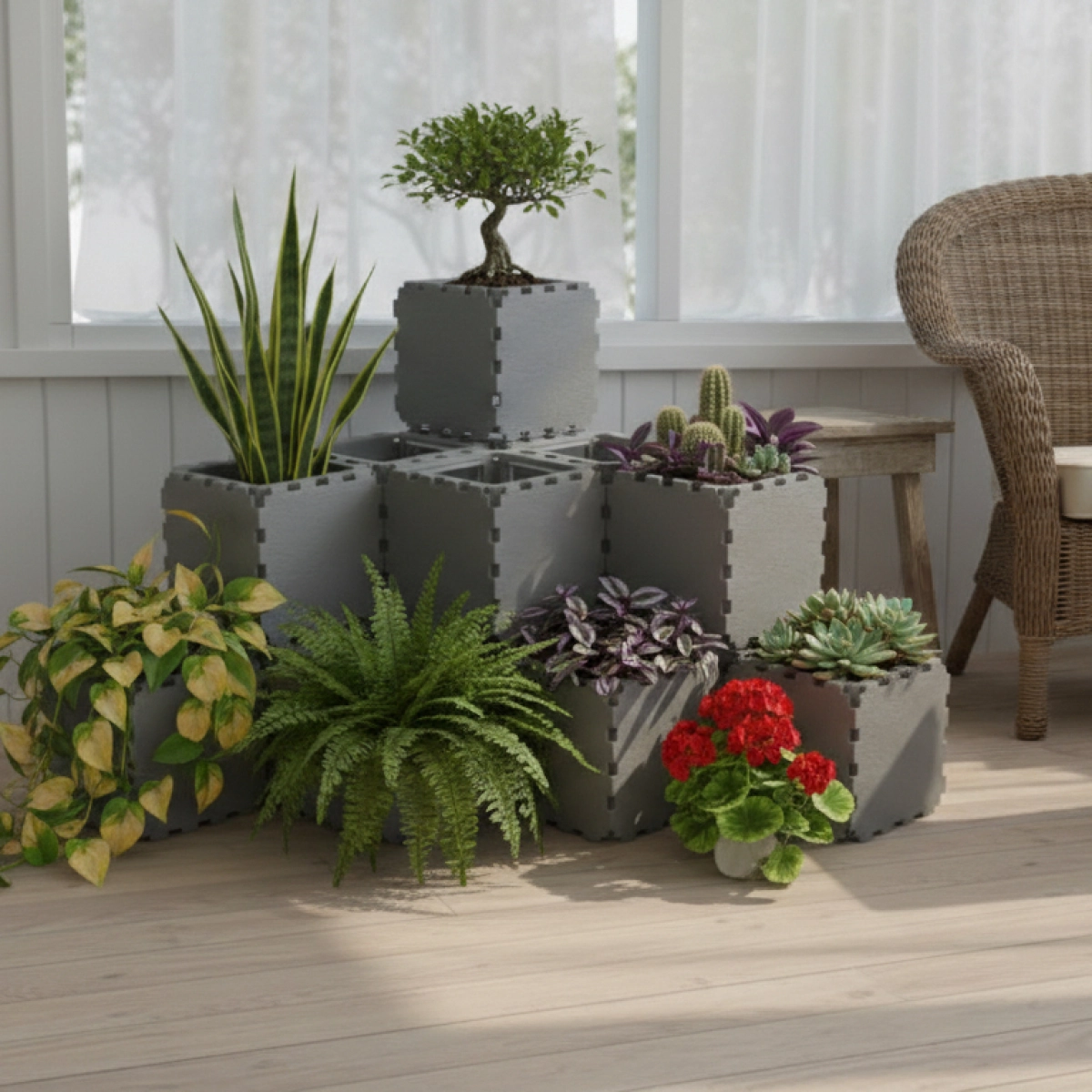 Nowoczesna narożna modułowa donica zaprojektowana do tworzenia pięknych stopniowanych roślin w każdym wnętrzu lub na balkonie. Zbudowana z kostek Cubik.one, struktura ta pozwala na uprawę wielu roślin w jednym pionowym układzie, jednocześnie oszczędzając miejsce na podłodze.