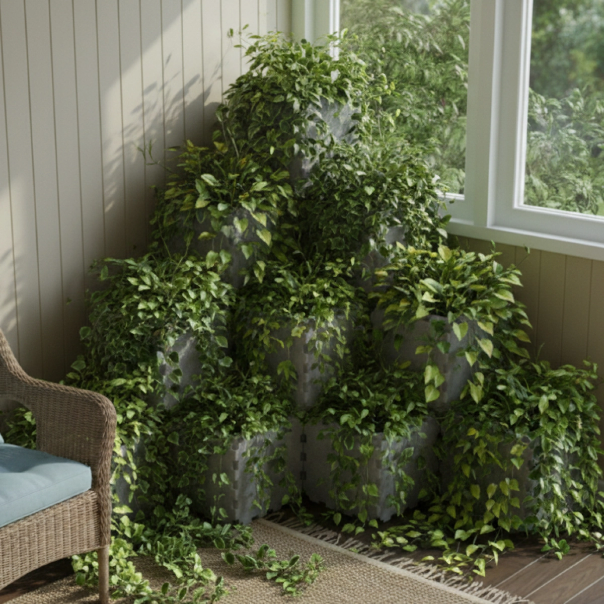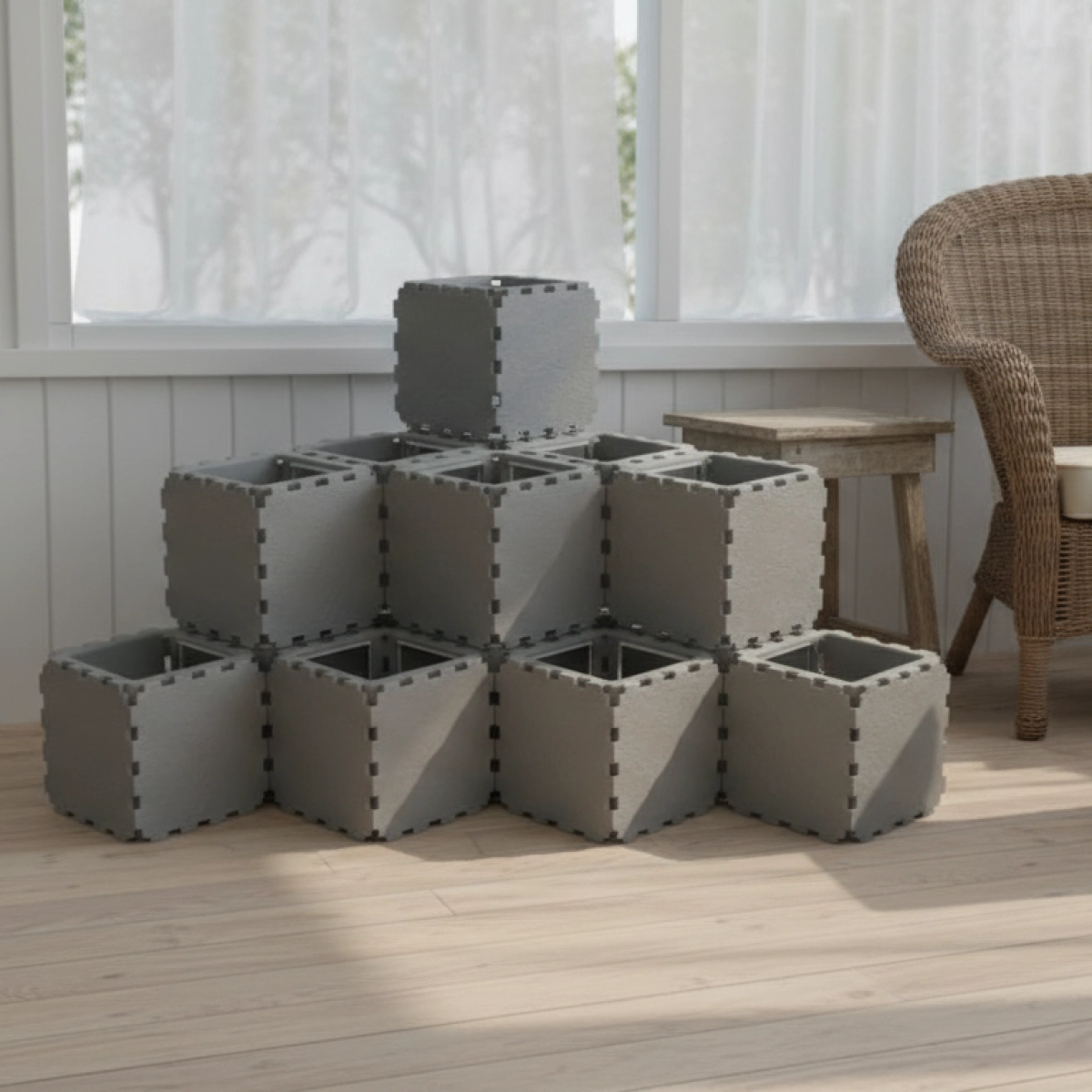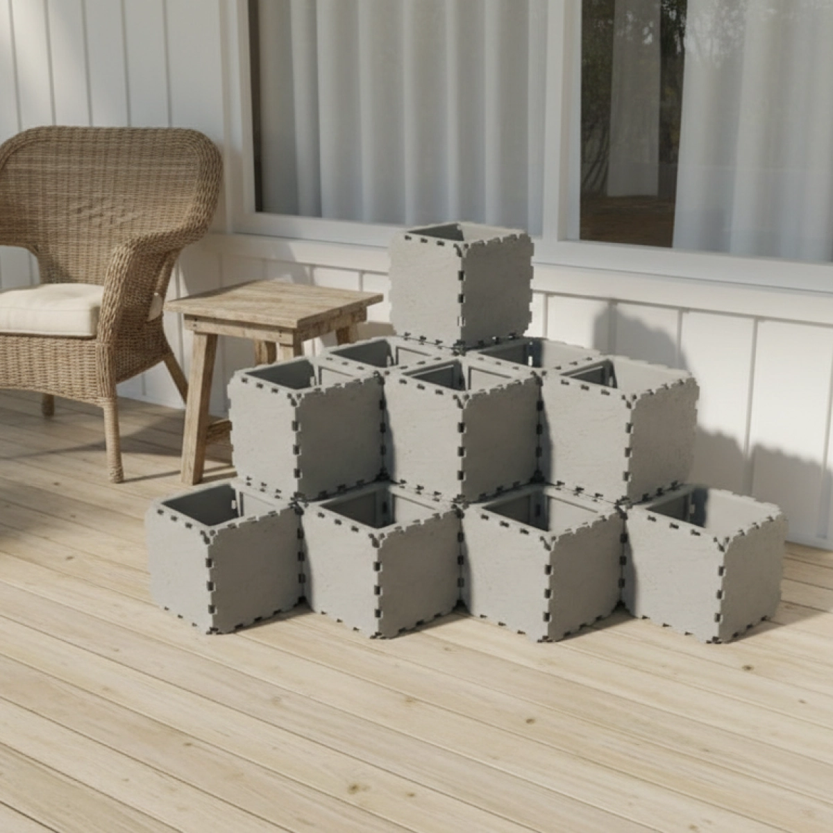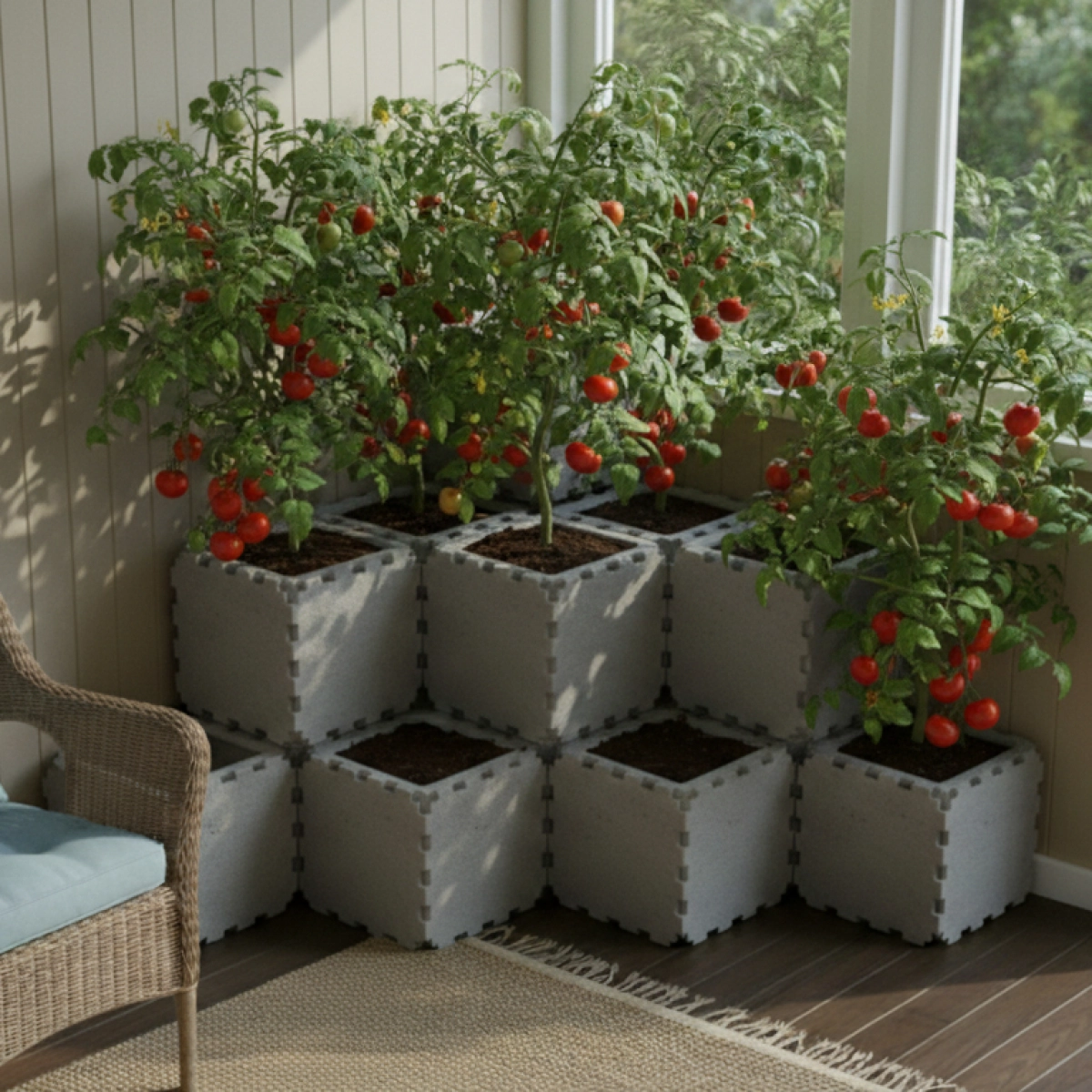 Nowoczesna narożna modułowa donica zaprojektowana do tworzenia pięknych stopniowanych roślin w każdym wnętrzu lub na balkonie. Zbudowana z kostek Cubik.one, struktura ta pozwala na uprawę wielu roślin w jednym pionowym układzie, jednocześnie oszczędzając miejsce na podłodze.