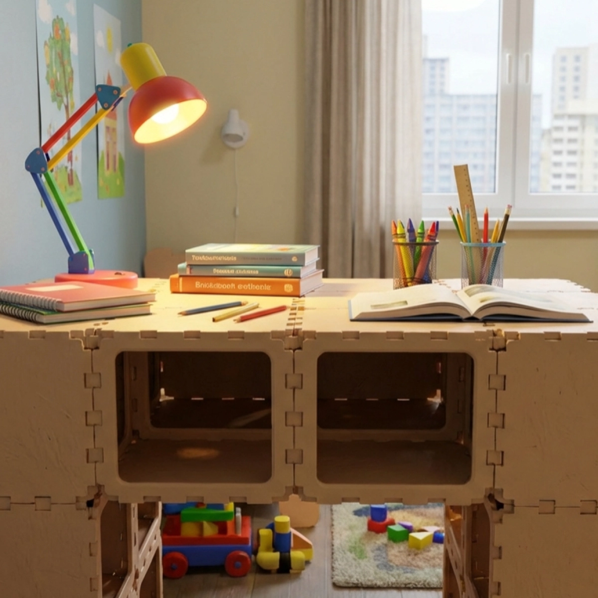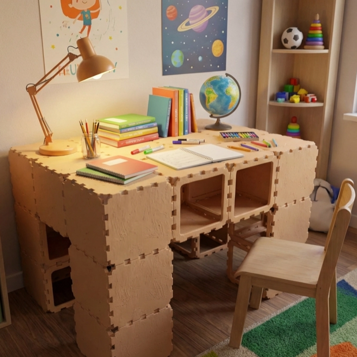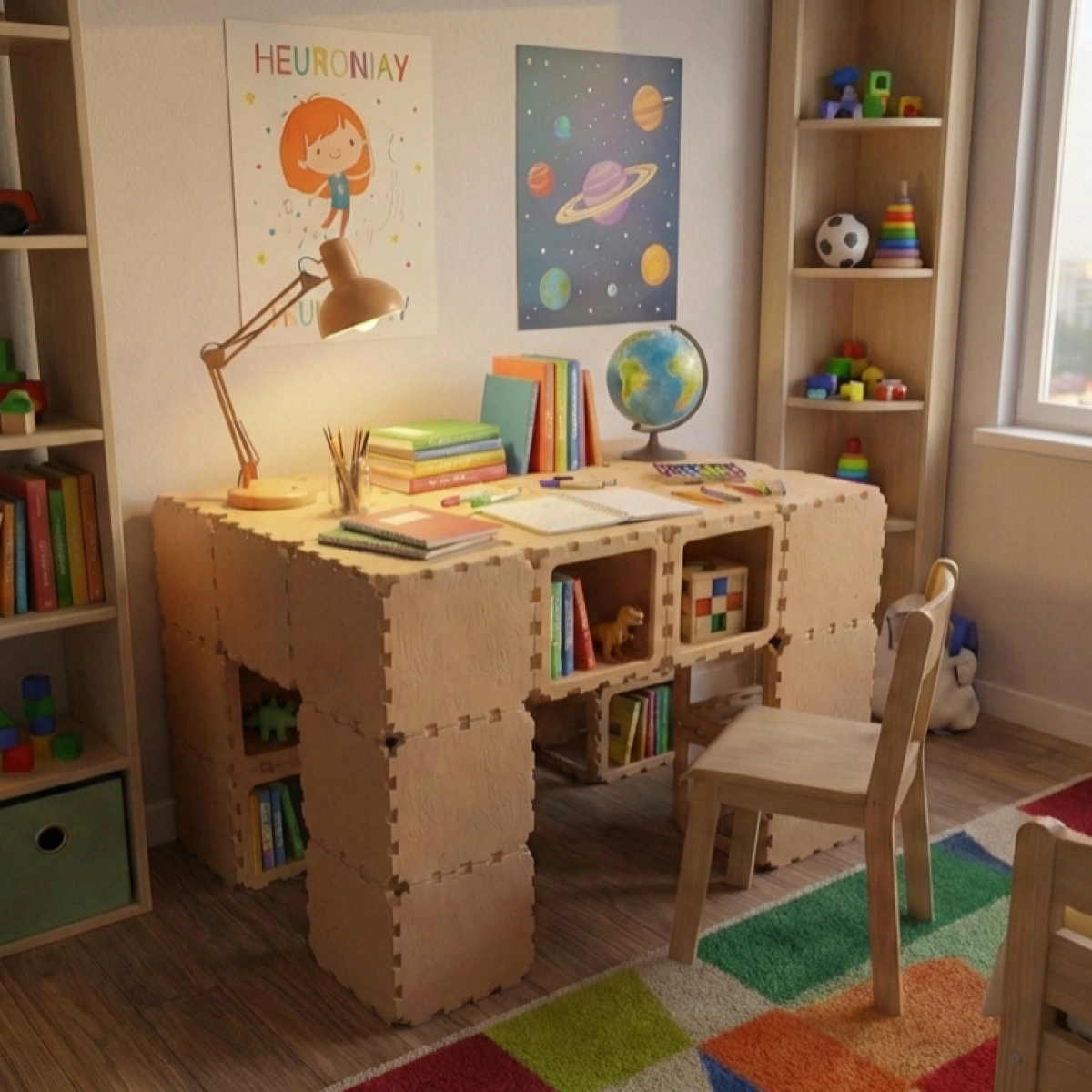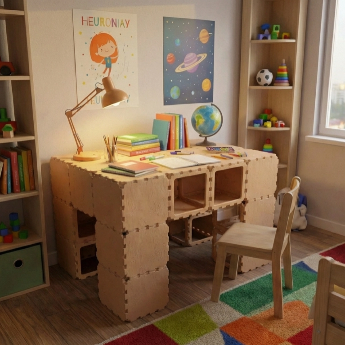 Bezpieczne i funkcjonalne biurko do pokoju dziecięcego, zbudowane z wytrzymałych modułowych kostek Cubik.one. Idealne do nauki, rysowania, czytania i codziennej zabawy. Konstrukcja jest stabilna, nie ma ostrych narożników i wygląda czysto i nowocześnie.