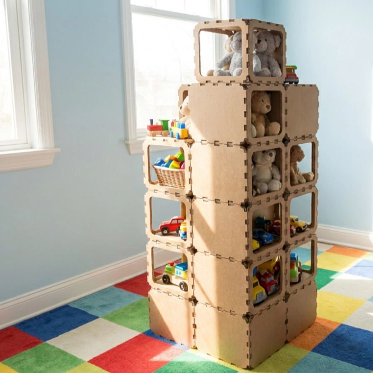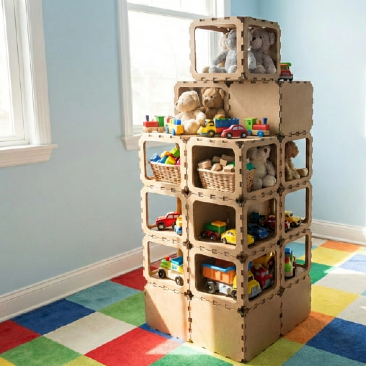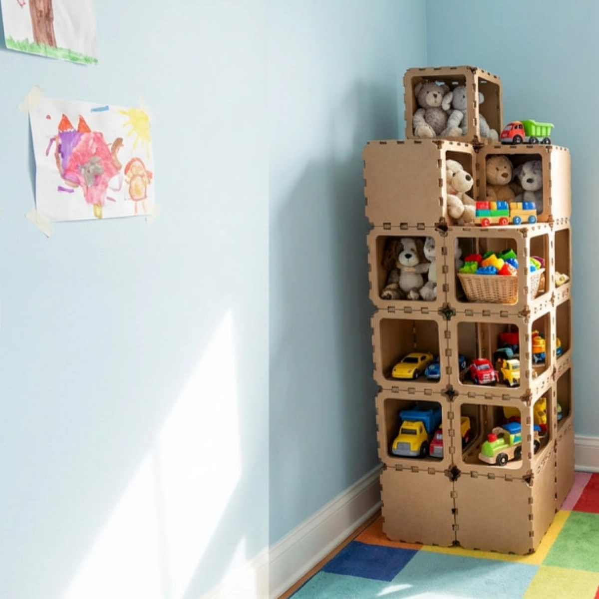 Praktyczna i stylowa półka do przechowywania w pokoju dziecięcym, zbudowana z wytrzymałych kostek modułowych Cubik.one. Idealna do porządkowania zabawek, książek, pluszaków i przedmiotów codziennego użytku. Otwarte przegródki ułatwiają dzieciom samodzielny dostęp i odkładanie rzeczy.
