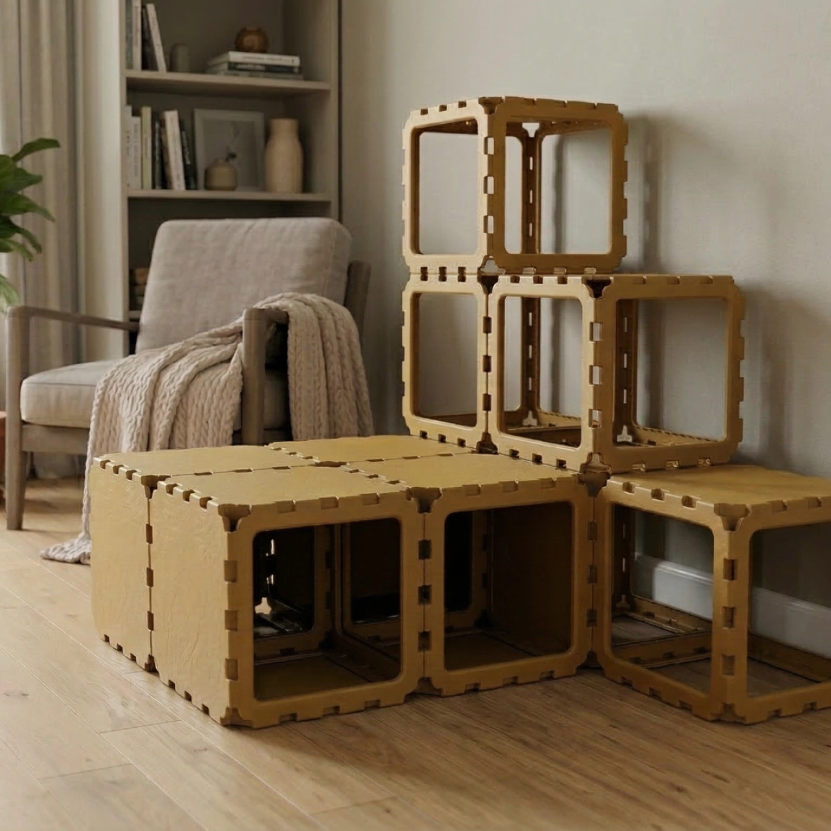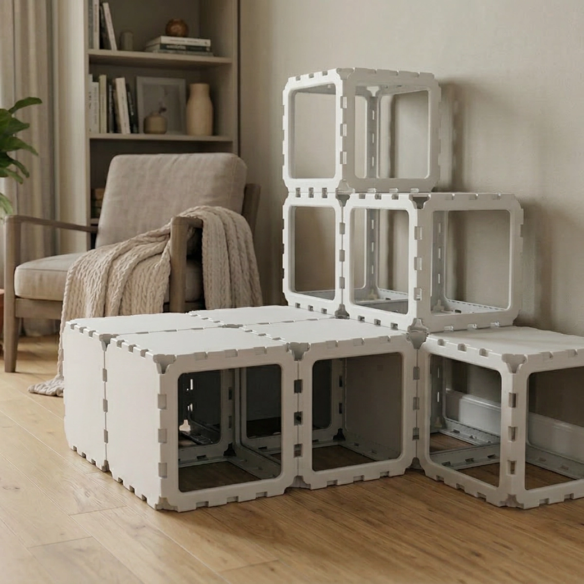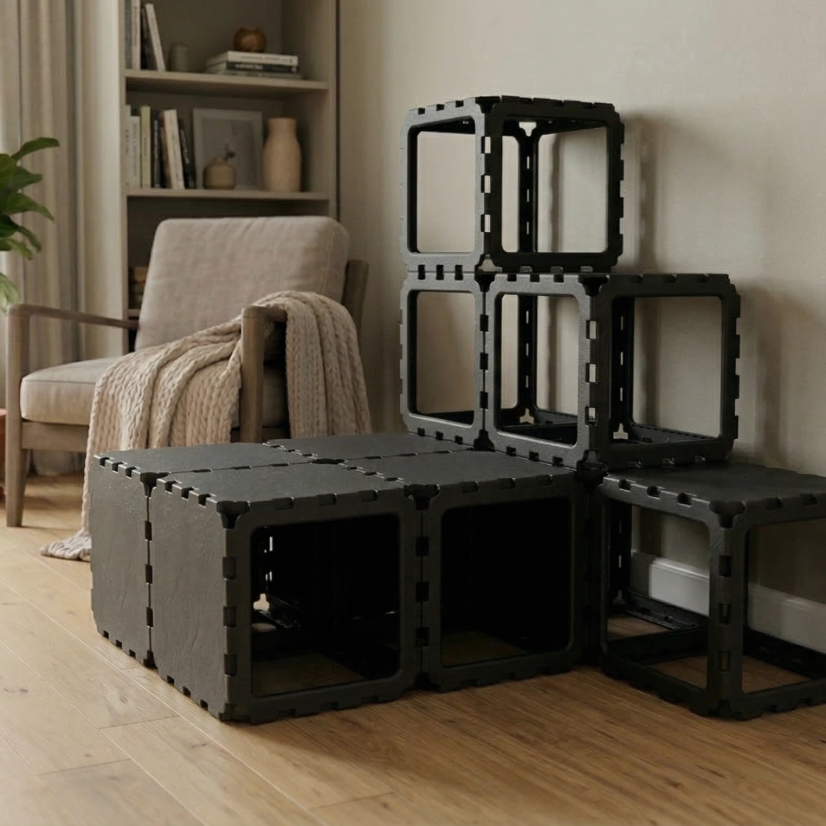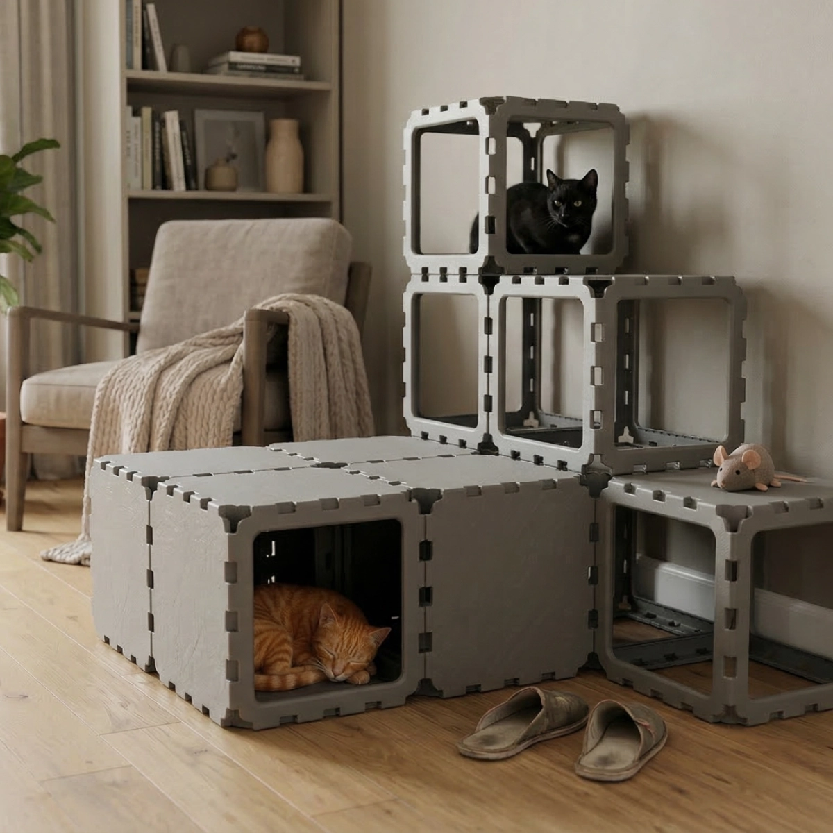 A modular cat house designed with a built-in staircase for climbing and exploration. Cats can move through the lower tunnel, then use the step-like cubes to reach higher levels and rest on top. The open VOID panels keep the structure light and breathable, while the multi-level design keeps cats active and engaged — perfect for play, climbing, and relaxing.