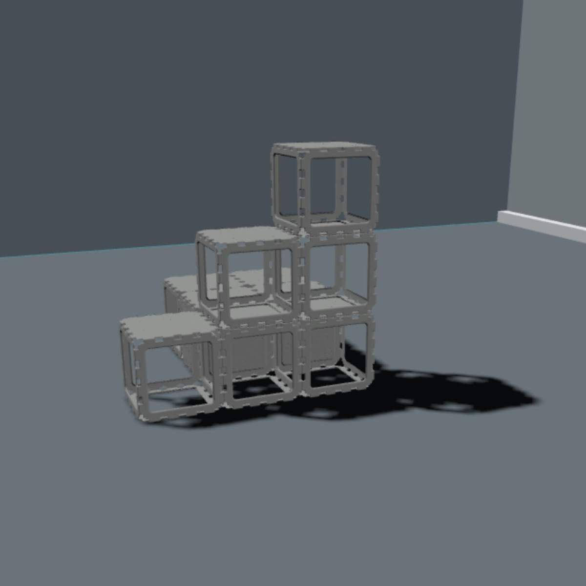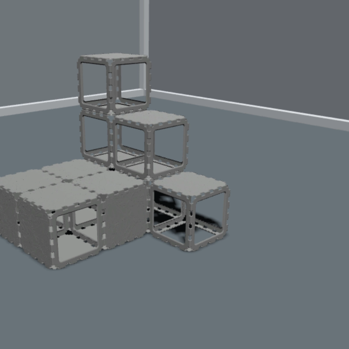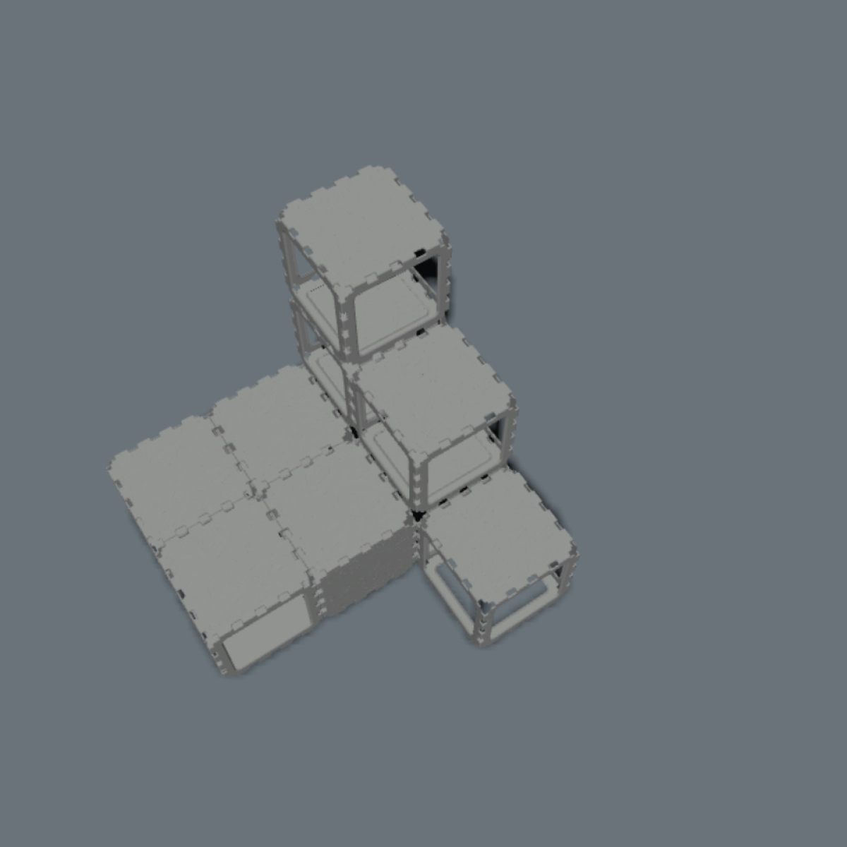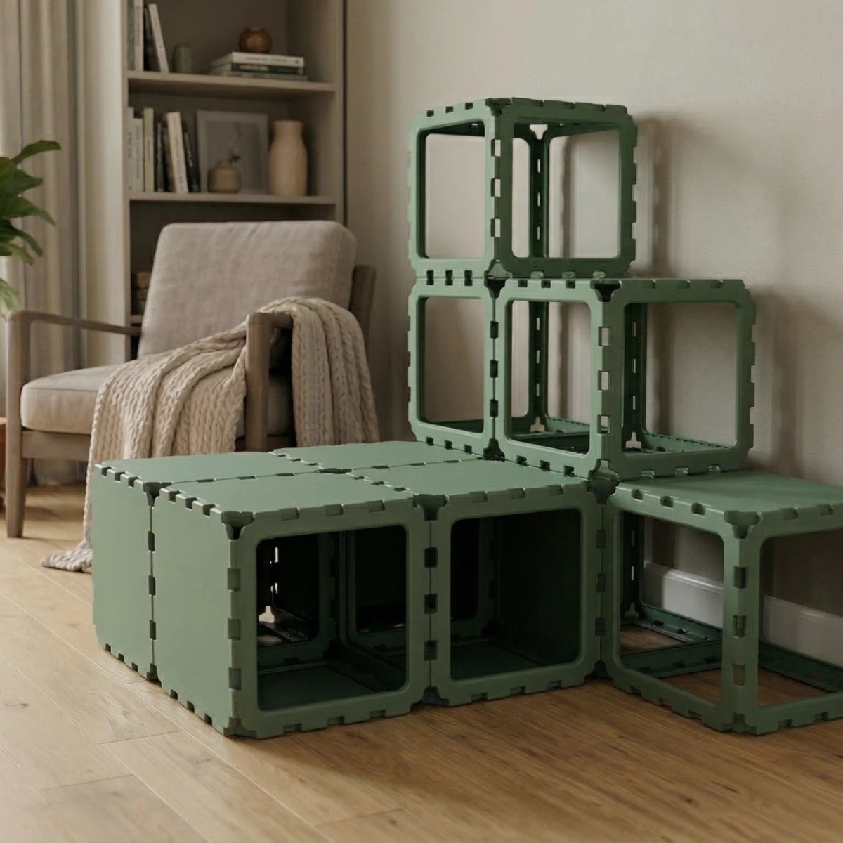 A modular cat house designed with a built-in staircase for climbing and exploration. Cats can move through the lower tunnel, then use the step-like cubes to reach higher levels and rest on top. The open VOID panels keep the structure light and breathable, while the multi-level design keeps cats active and engaged — perfect for play, climbing, and relaxing.
