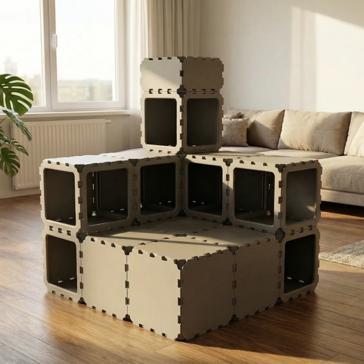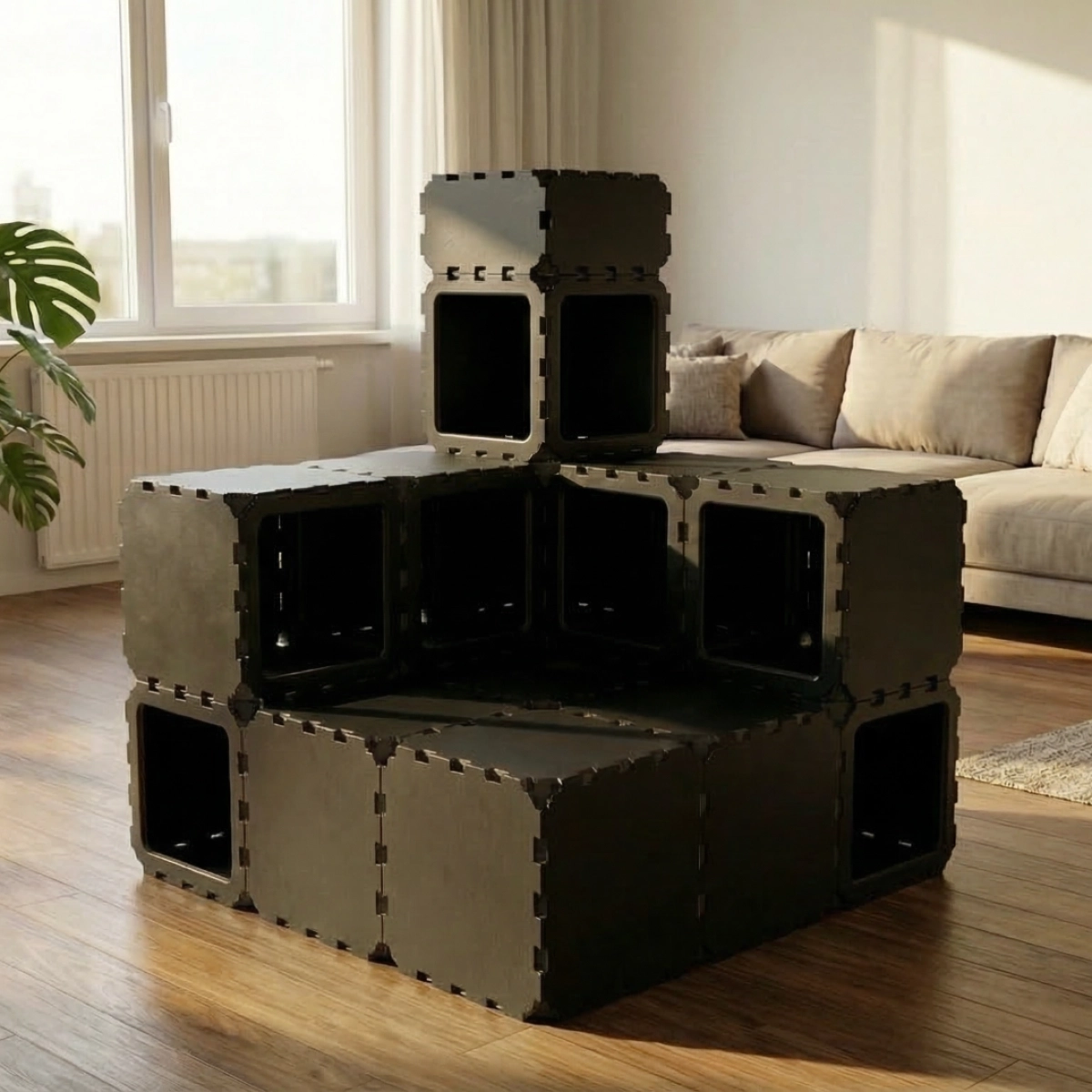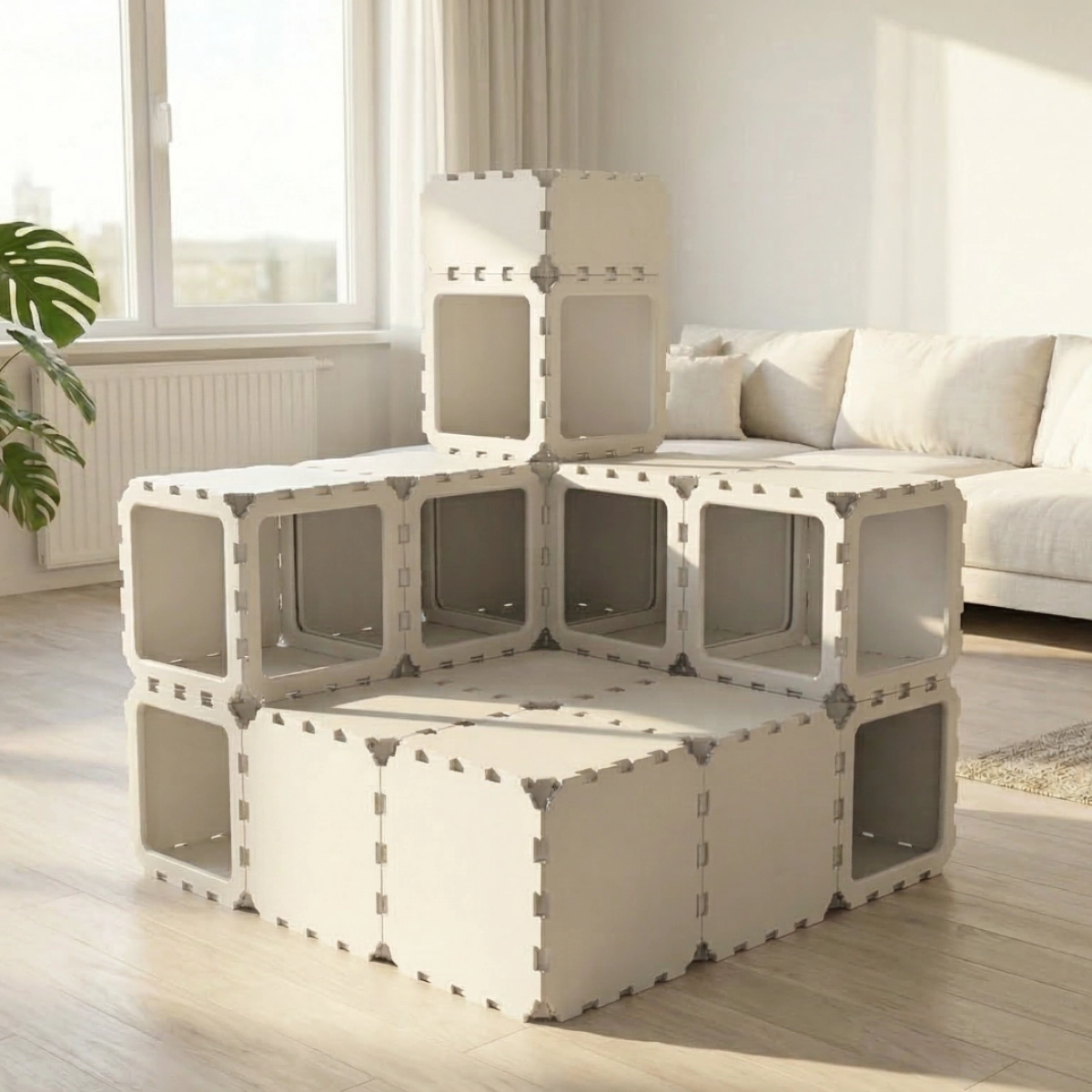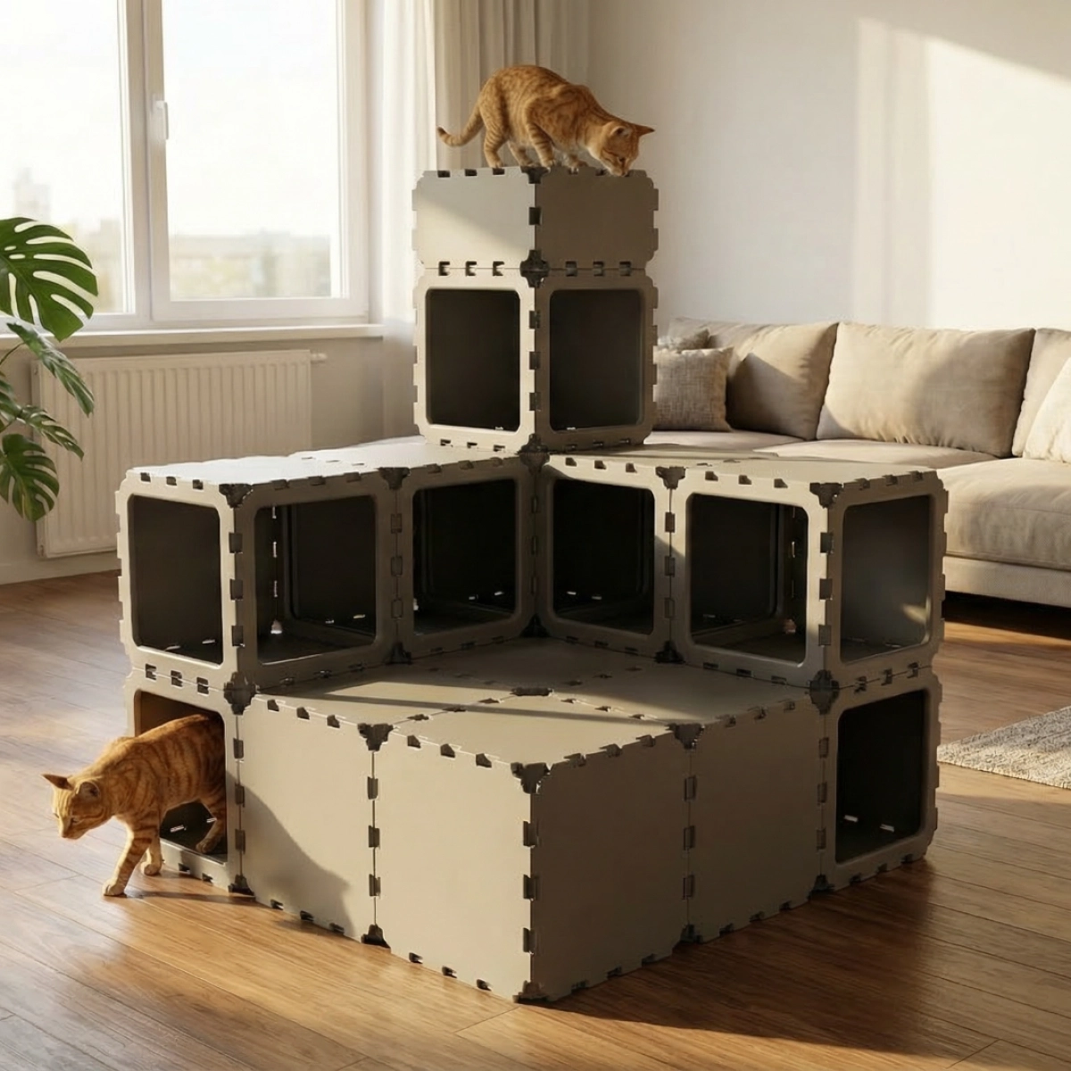 A modular cat house with an elevated tower, designed for play, climbing, and rest. Cats can explore the lower tunnels made from VOID panels, hide inside, and move upward to the top cube for a higher vantage point. The combination of open spaces and height makes it especially engaging — cats love to climb, observe, and relax in their own cozy structure.