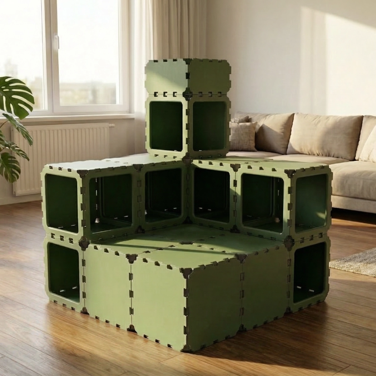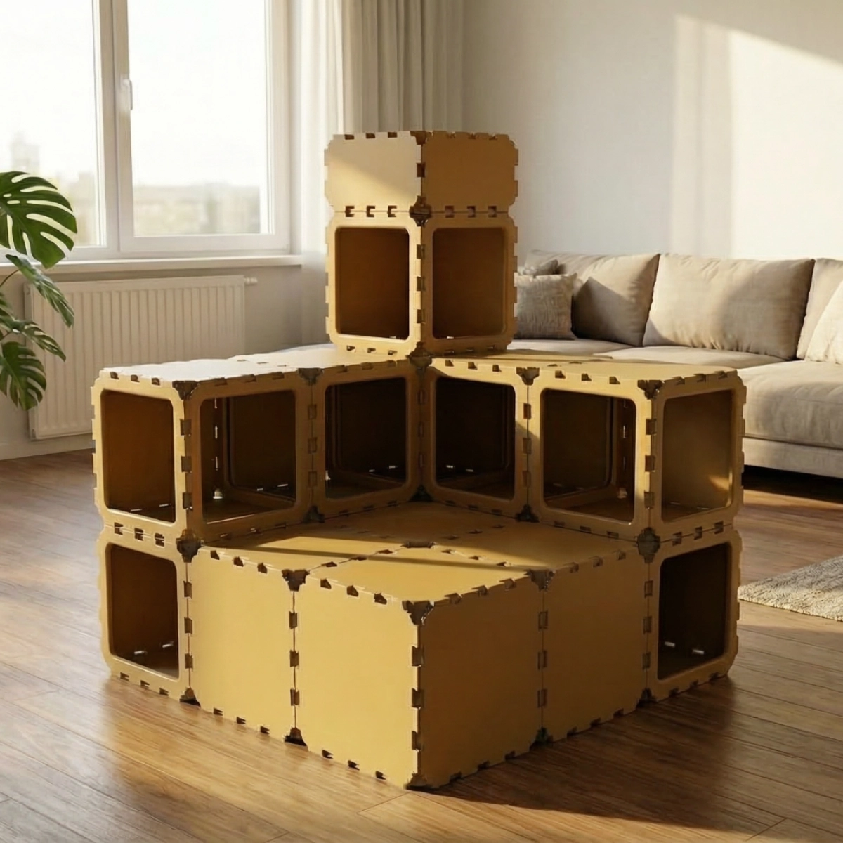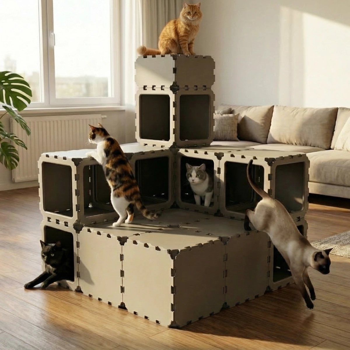 A modular cat house with an elevated tower, designed for play, climbing, and rest. Cats can explore the lower tunnels made from VOID panels, hide inside, and move upward to the top cube for a higher vantage point. The combination of open spaces and height makes it especially engaging — cats love to climb, observe, and relax in their own cozy structure.