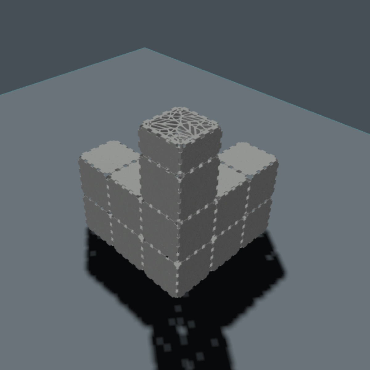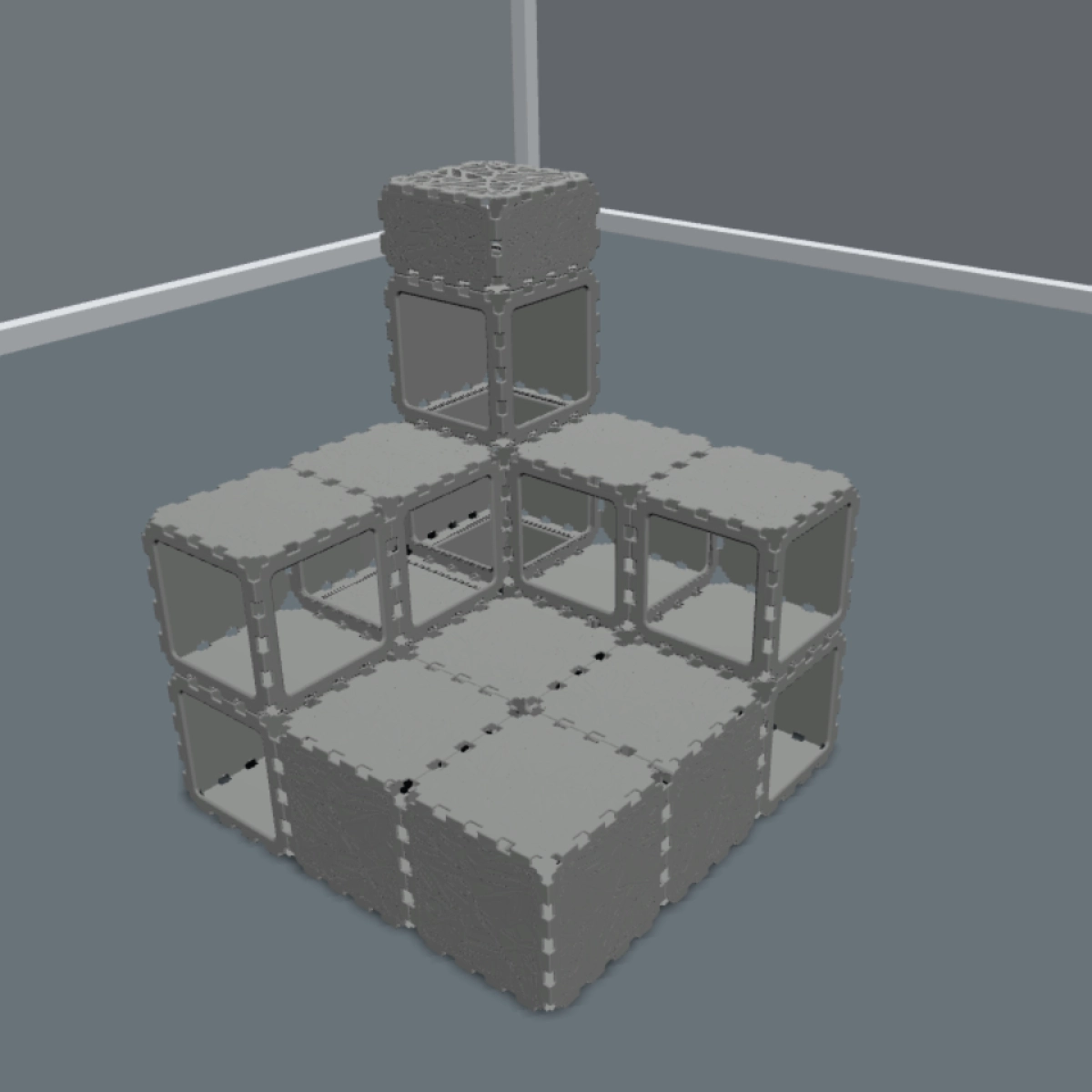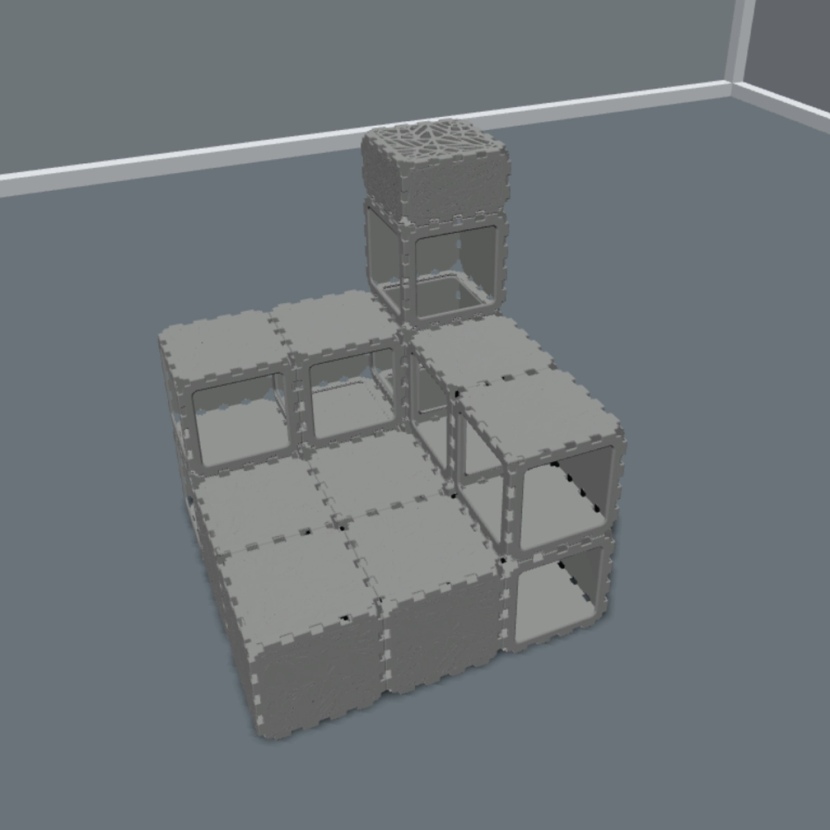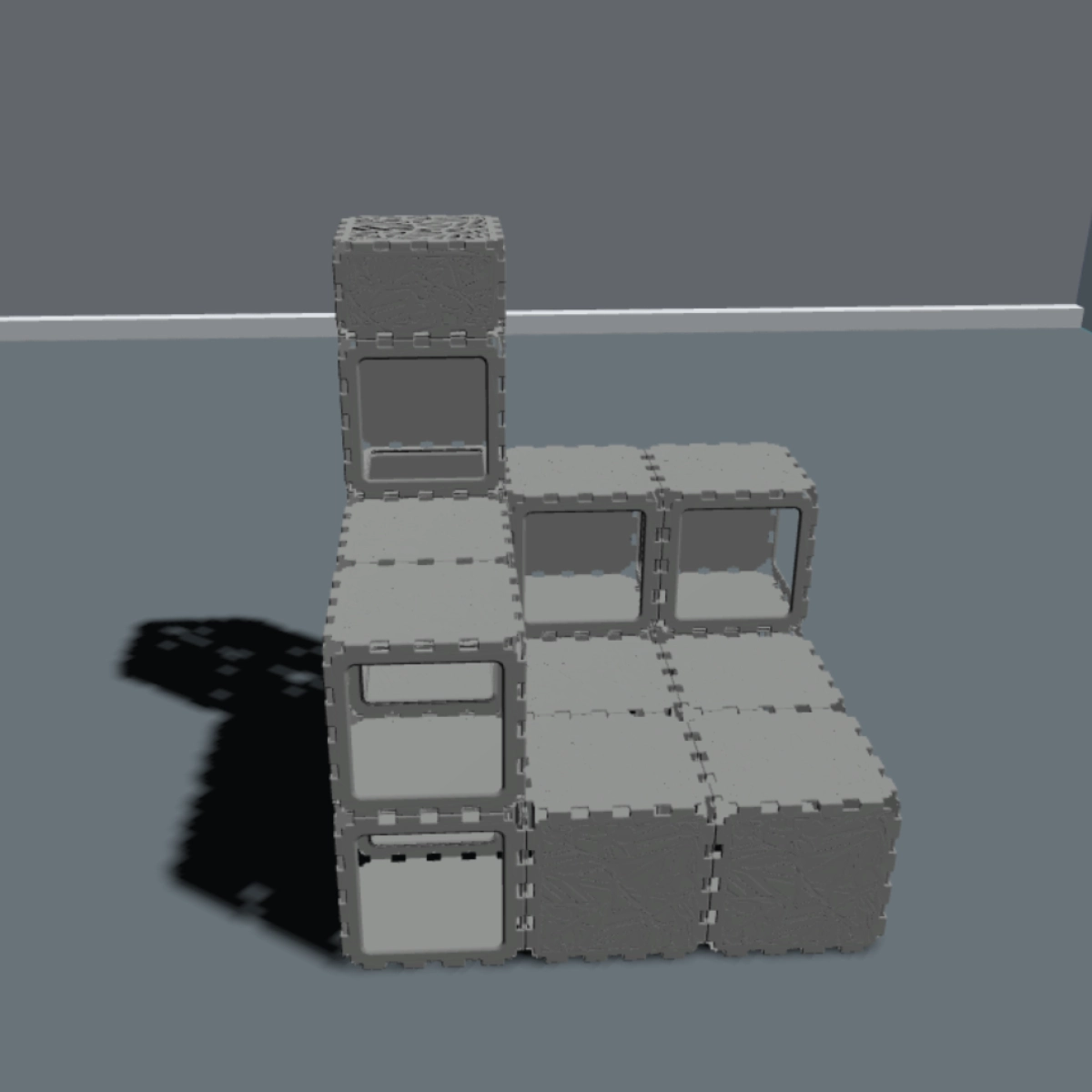 A modular cat house with an elevated tower, designed for play, climbing, and rest. Cats can explore the lower tunnels made from VOID panels, hide inside, and move upward to the top cube for a higher vantage point. The combination of open spaces and height makes it especially engaging — cats love to climb, observe, and relax in their own cozy structure.
