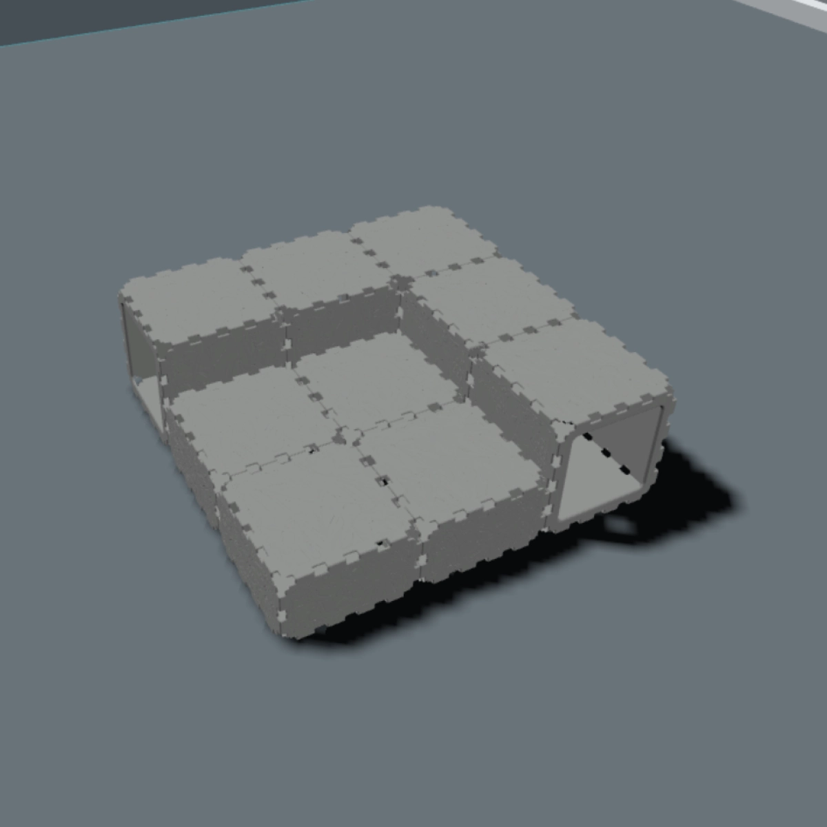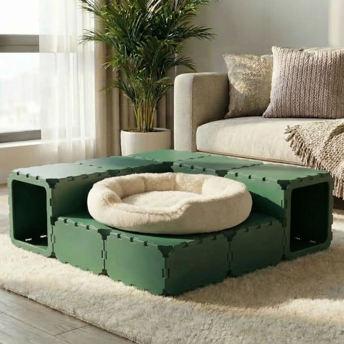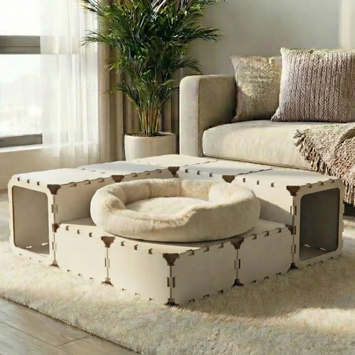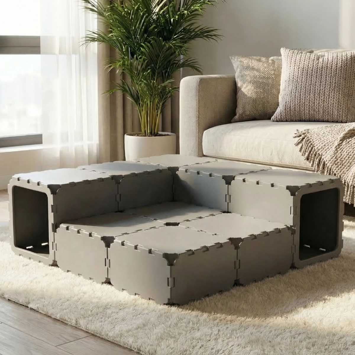 A cozy and playful cat house made from modular cubes, designed for both rest and fun. Cats can crawl through the tunnel built from VOID panels, hide inside, and sleep comfortably — they absolutely love it. Perfect for play, relaxation, and exploring their own little space.
