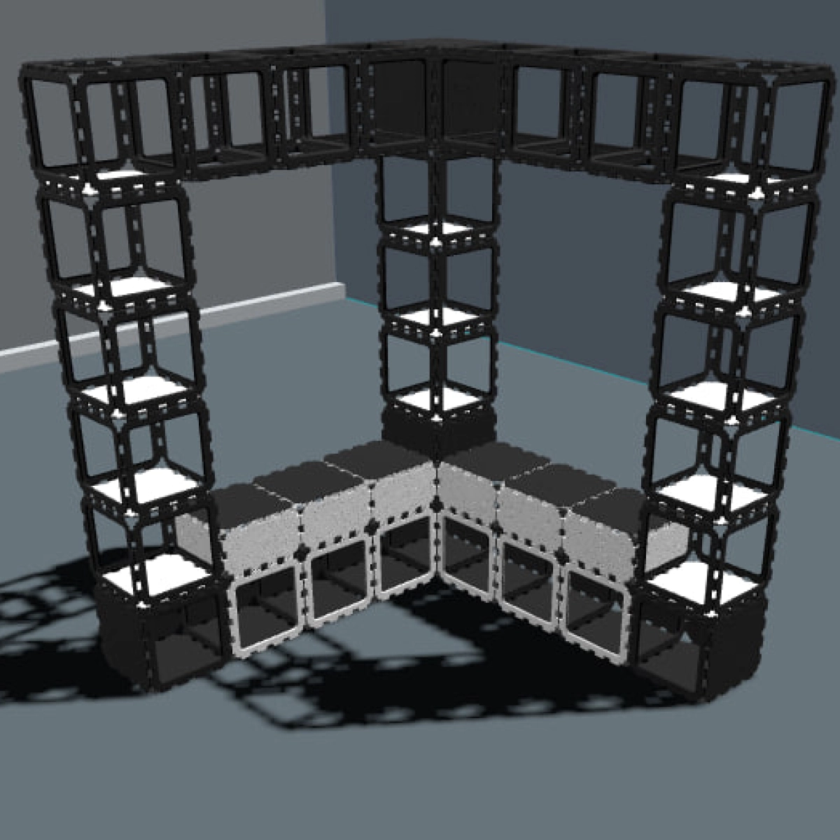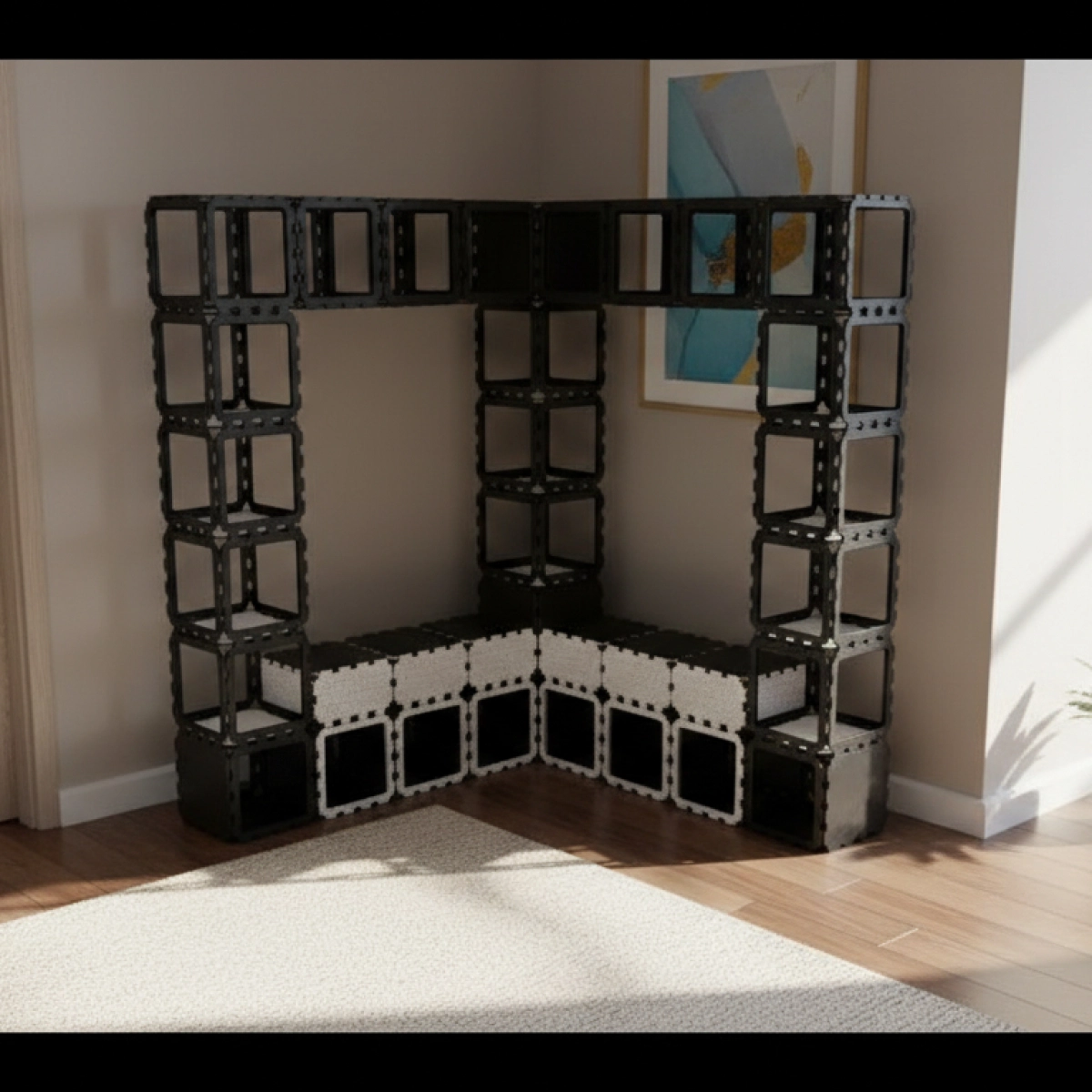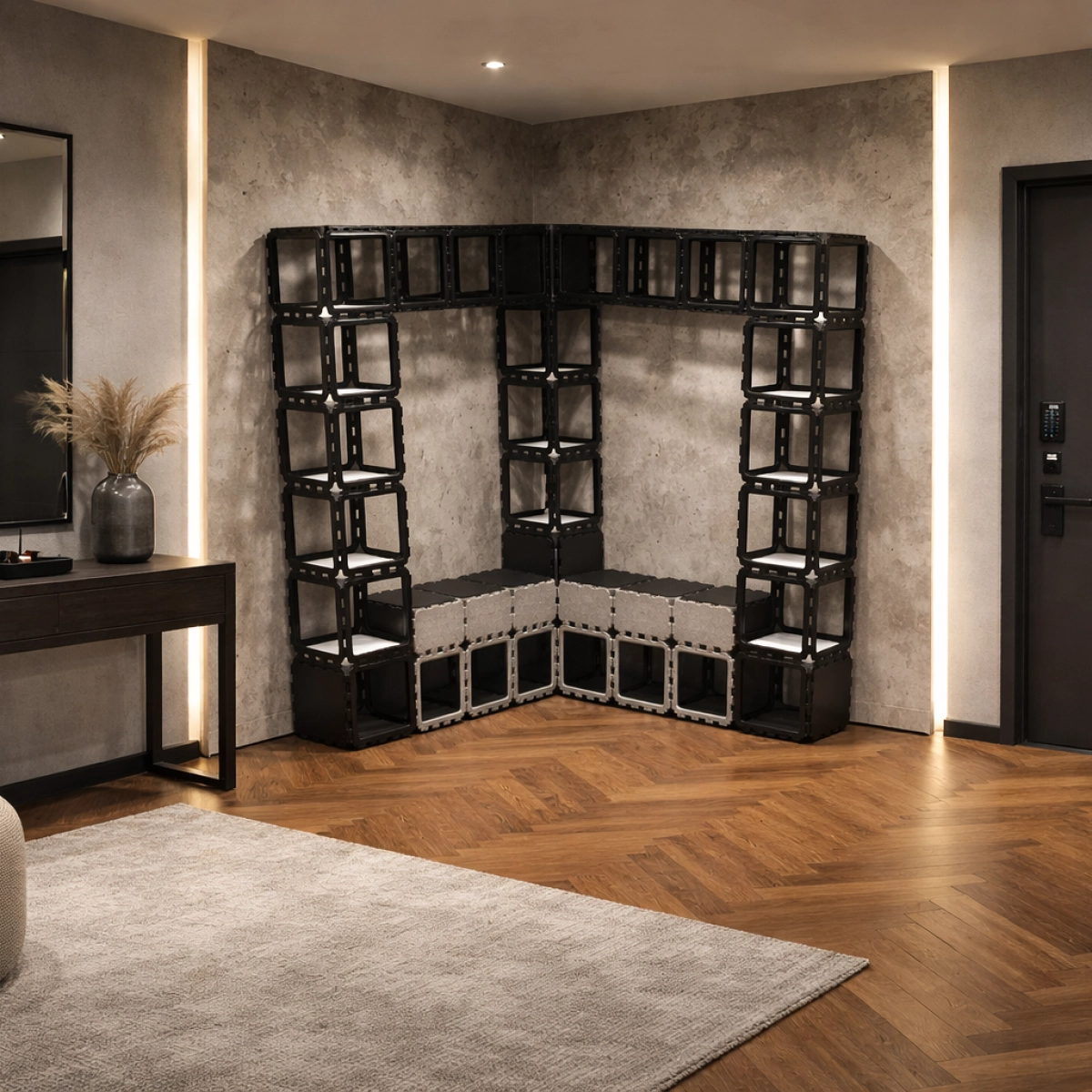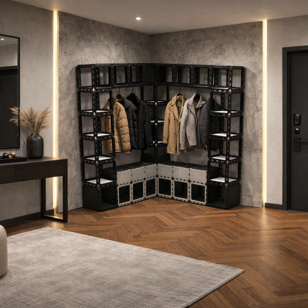 Ta modułowa szafa narożna jest zbudowana z wytrzymałych kostek Cubik.one, tworząc mocne i efektowne wizualnie rozwiązanie do przechowywania w nowoczesnych przedpokojach. Otwarta konstrukcja pozwala na swobodne wieszanie kurtek, podczas gdy górne półki zapewniają miejsce na rośliny, książki i osobiste akcesoria.