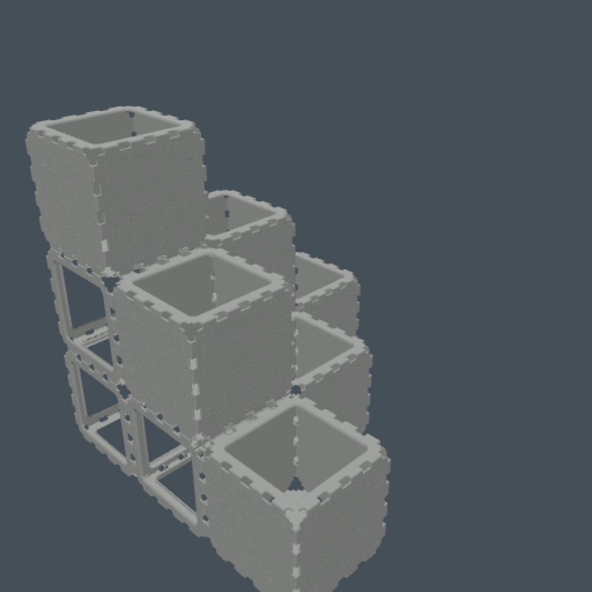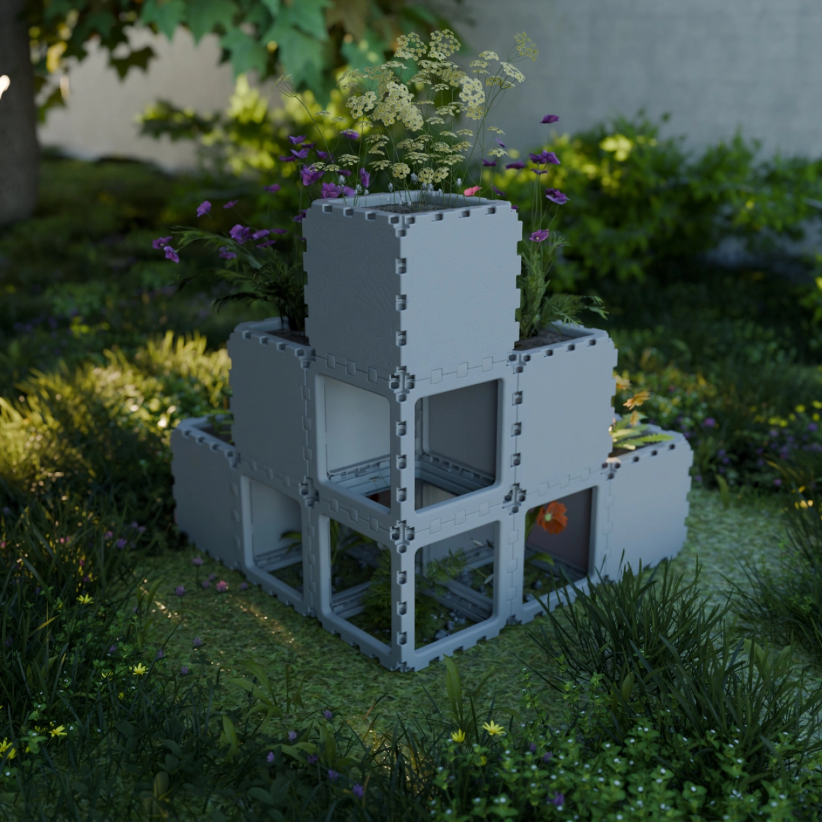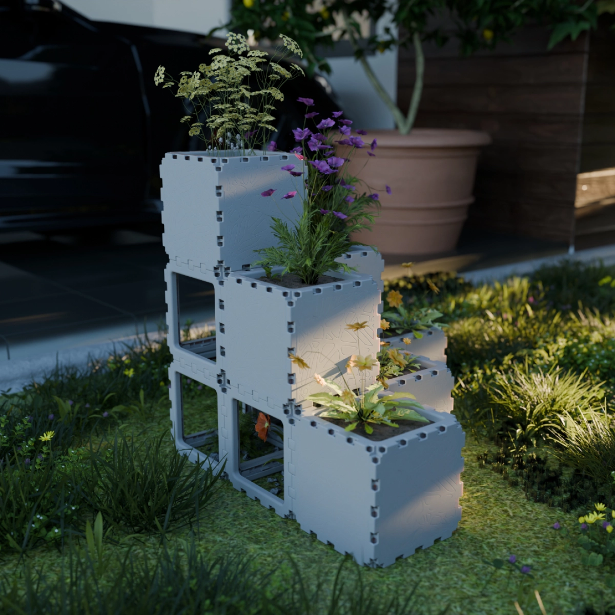 Schodkowa struktura ogrodowa wykonana z dziesięciu sześcianów. Tworzy wielopoziomowy układ nasadzeń, w którym rośliny rosną na różnych wysokościach, tworząc wyrazistą kompozycję ogrodową.