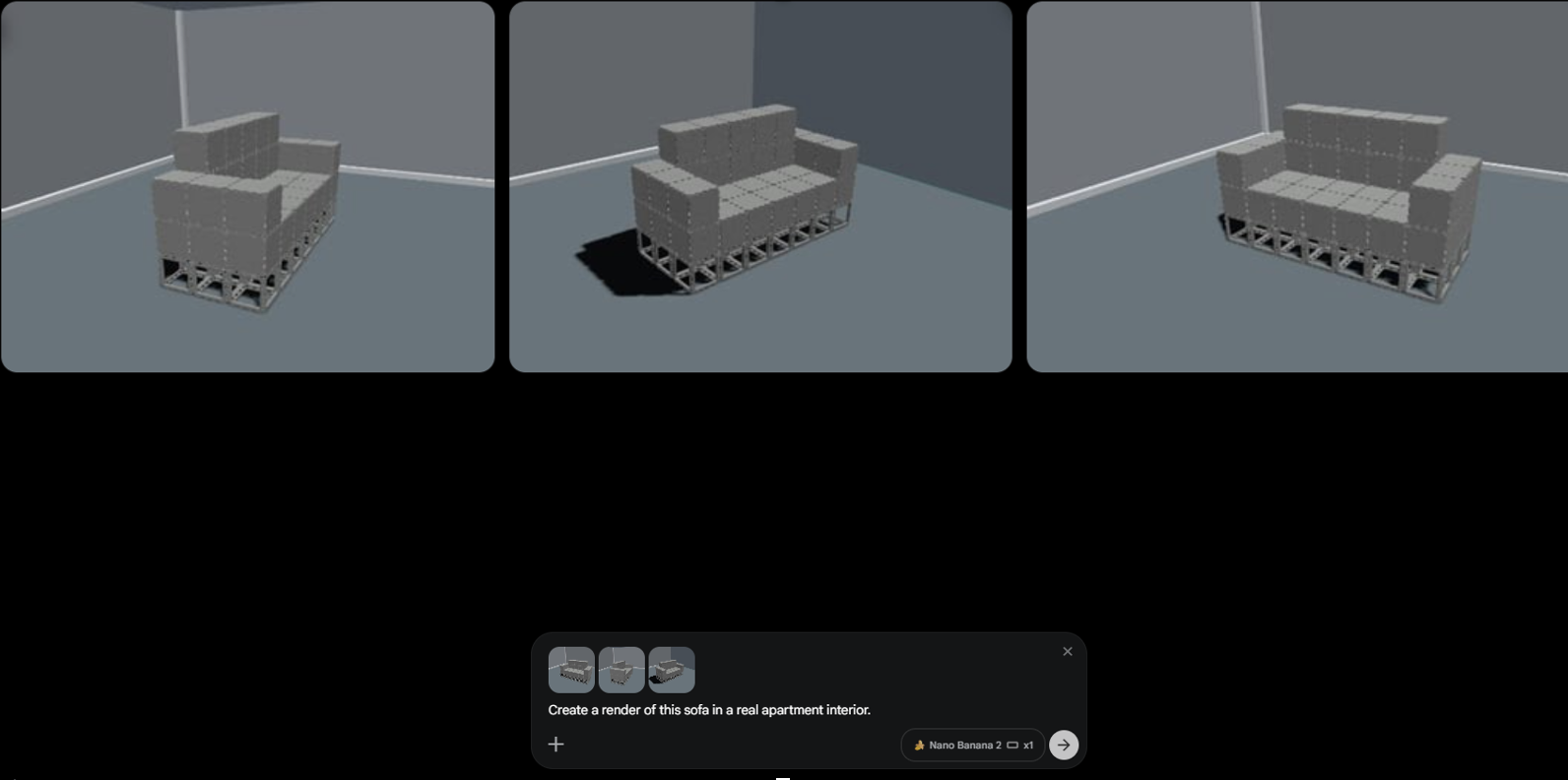 Następnie otwórz zewnętrzną usługę renderowania AI, taką jak labs.google/fx, prześlij zrzuty ekranu i dodaj monit opisujący żądaną scenę. Przykład: "Utwórz render tej sofy w prawdziwym wnętrzu mieszkania".