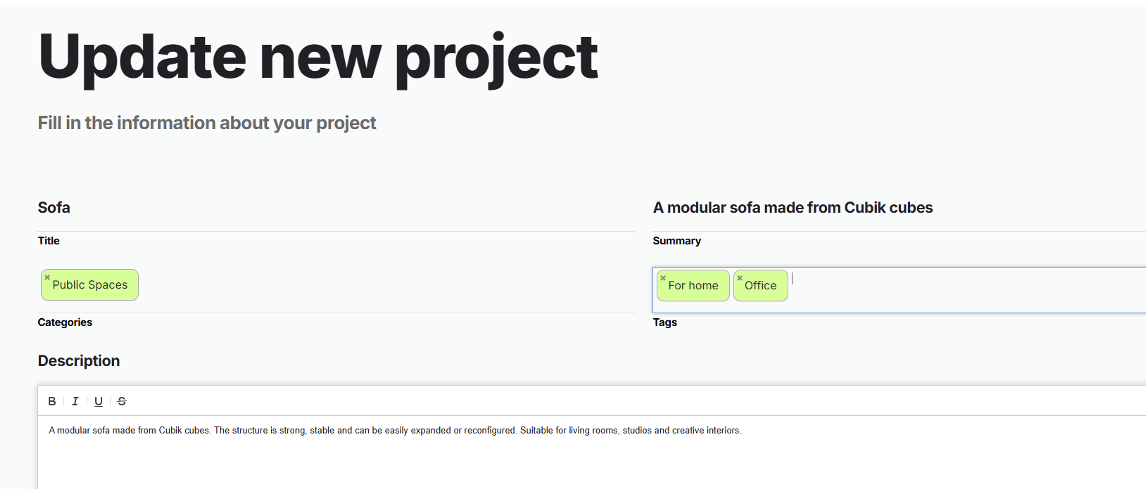 Pierwszy obraz zostanie użyty jako główny podgląd. Po zapisaniu projekt zostanie opublikowany na stronie internetowej.